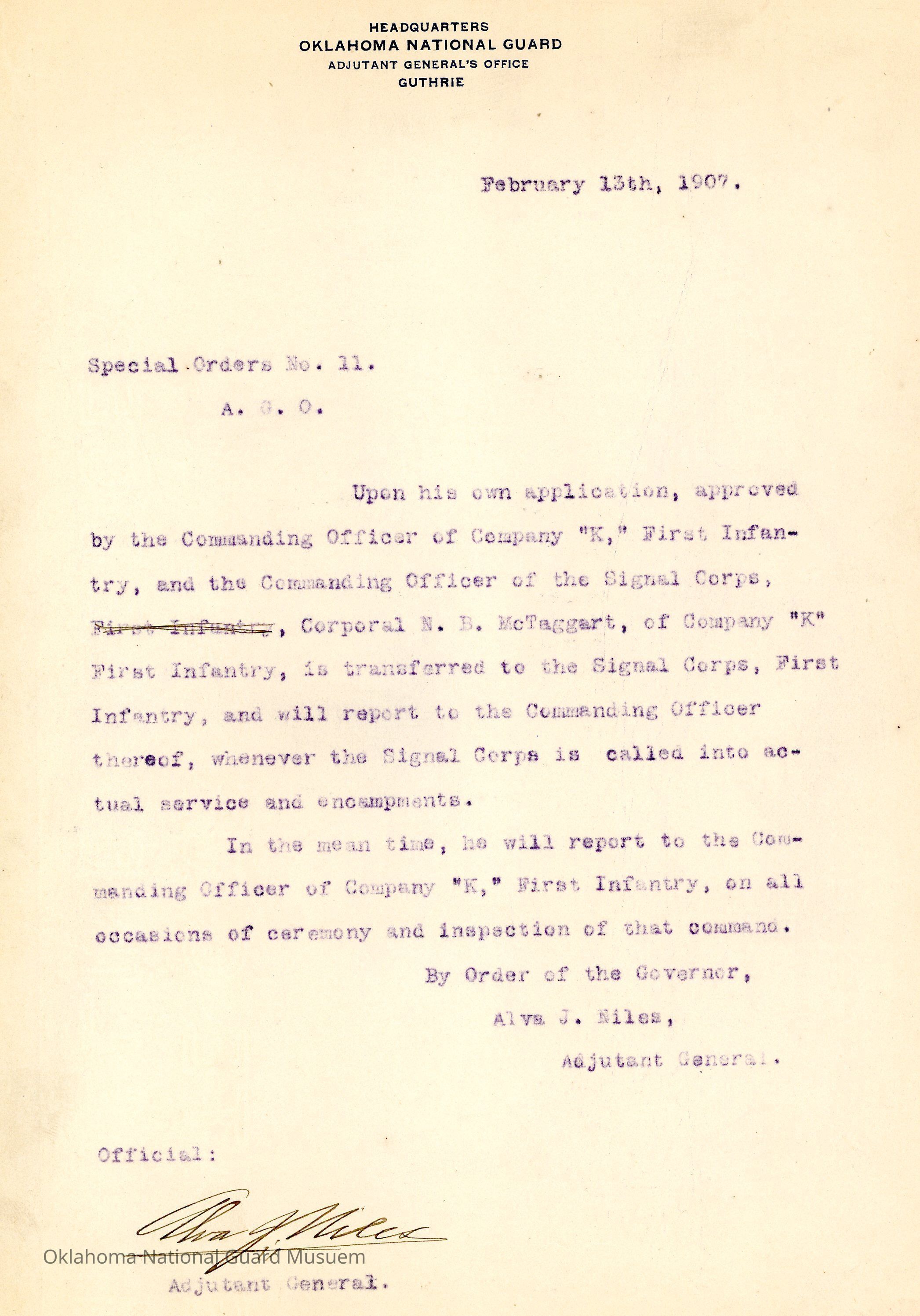 Special Order #11 from Headquarters Adjutant General's Office in Guthrie. The order transfers N.B. McTaggart from Company K First Infantry to the Signal CorpsDate(s) of Creation