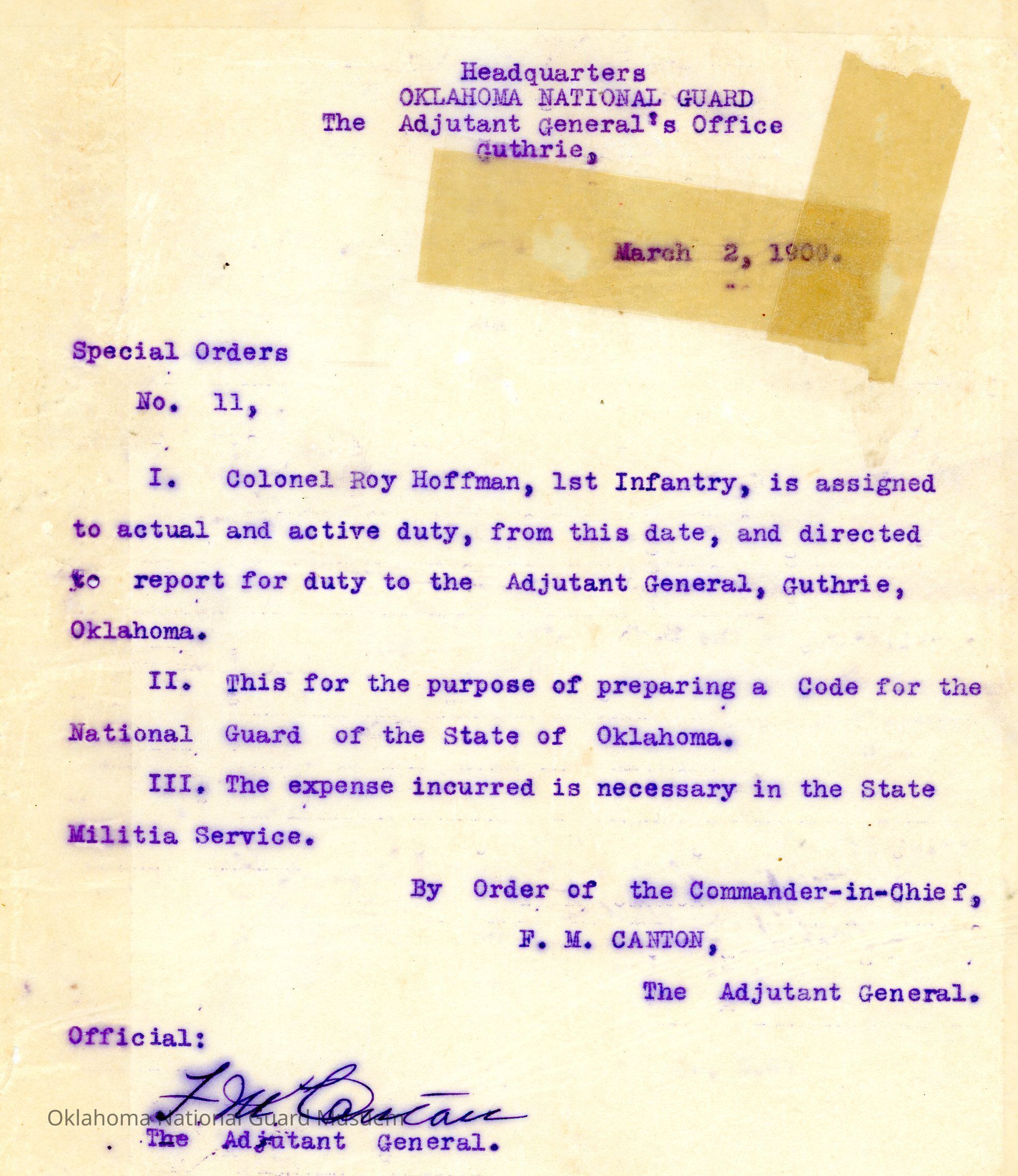 Special Order #11 from Headquarters Adjutant General's Office in Guthrie. The order assigns Roy Hoffman to active duty and directed to report to the Adjutant General's office to prepare a Code for the Oklahoma National GuardDate(s) of Creation