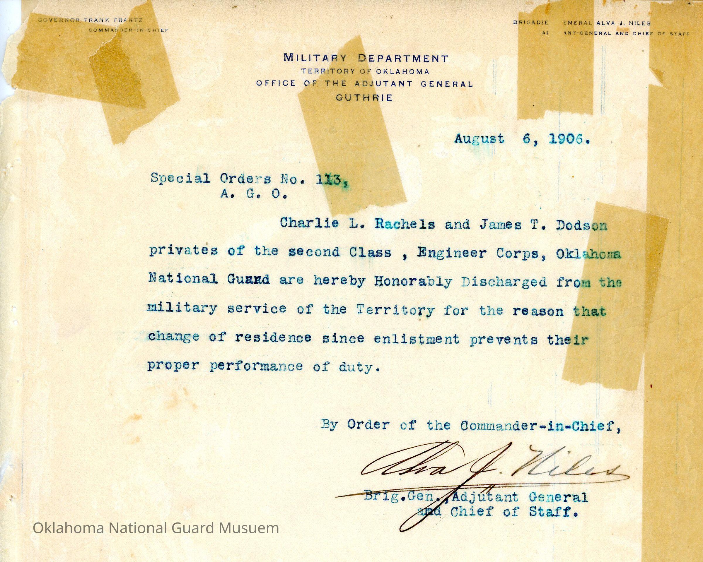 Adjutant General, Guthrie, Frank Frantz, Alva J. Niles, Engineer Corps, Honorable discharges, Charlie L. Rachels, James T. Dodson
