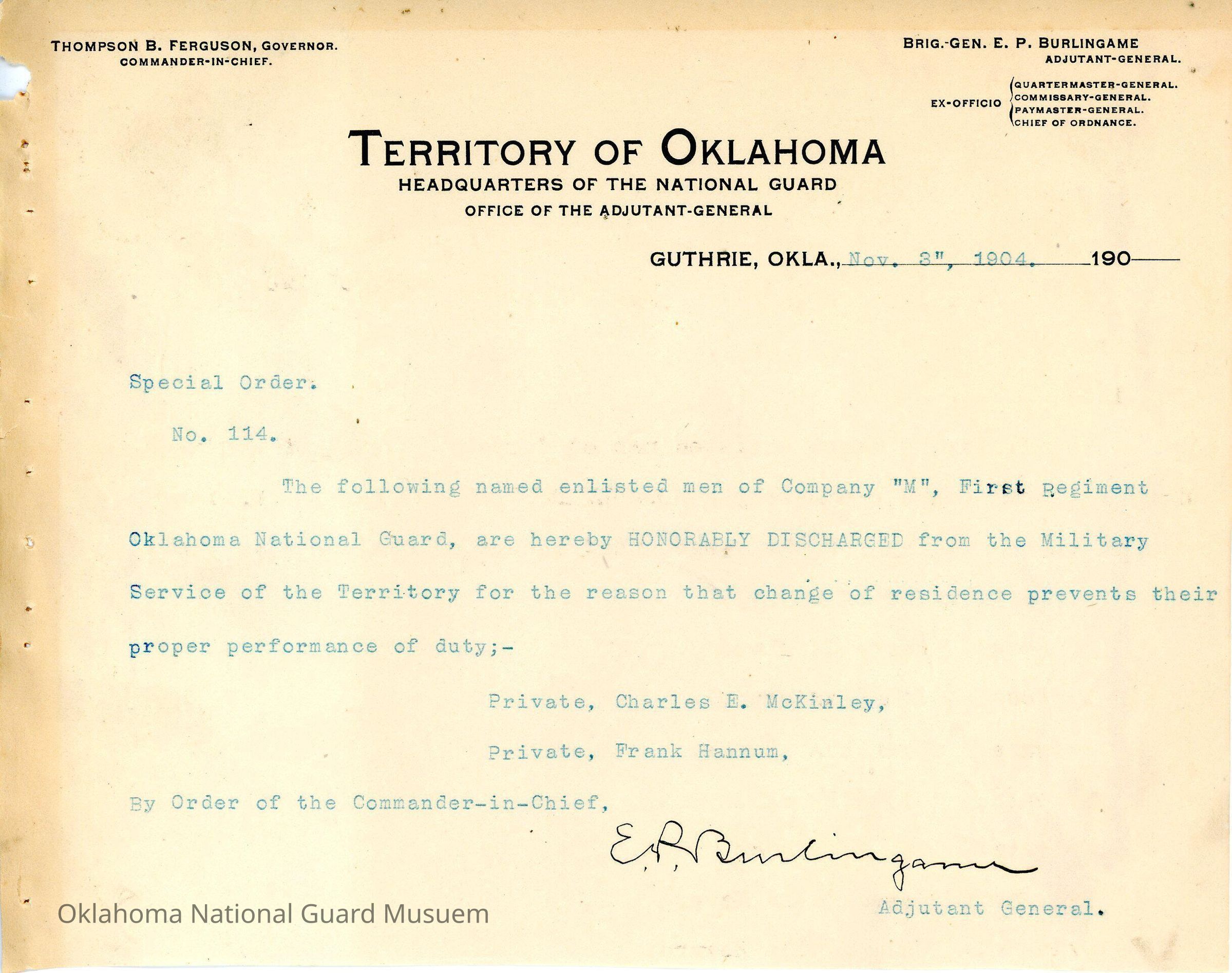 Adjutant General, Guthrie, E.P. Burlingame, Thompson B. Ferguson, First Regiment, Honorable discharges, Charles E. McKinley, Frank Hannum