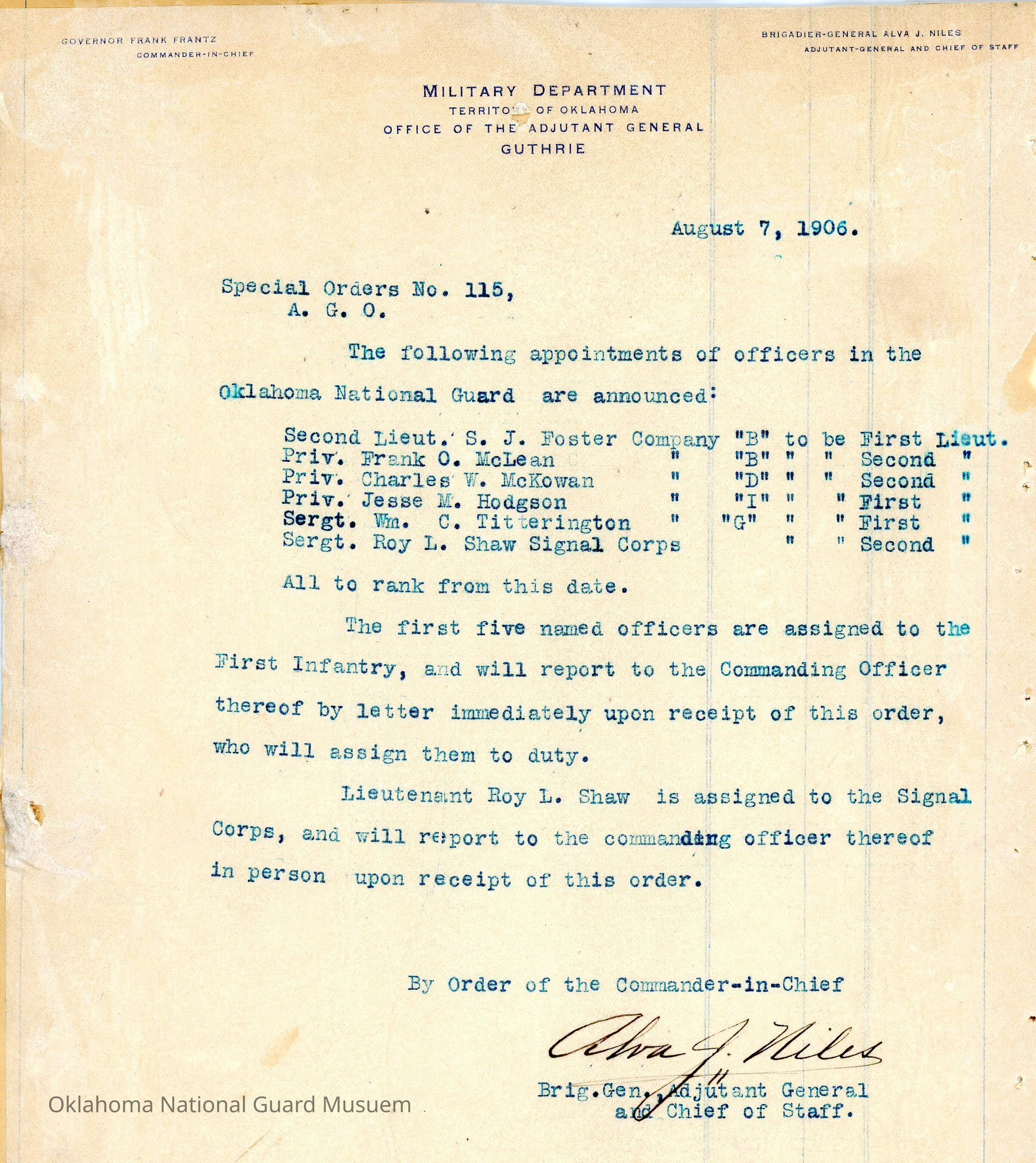 Special Order #115 from Headquarters Adjutant General's Office in Guthrie. The order lists the appointments and assignments in the First Infantry and Signal CorpsDate(s) of Creation