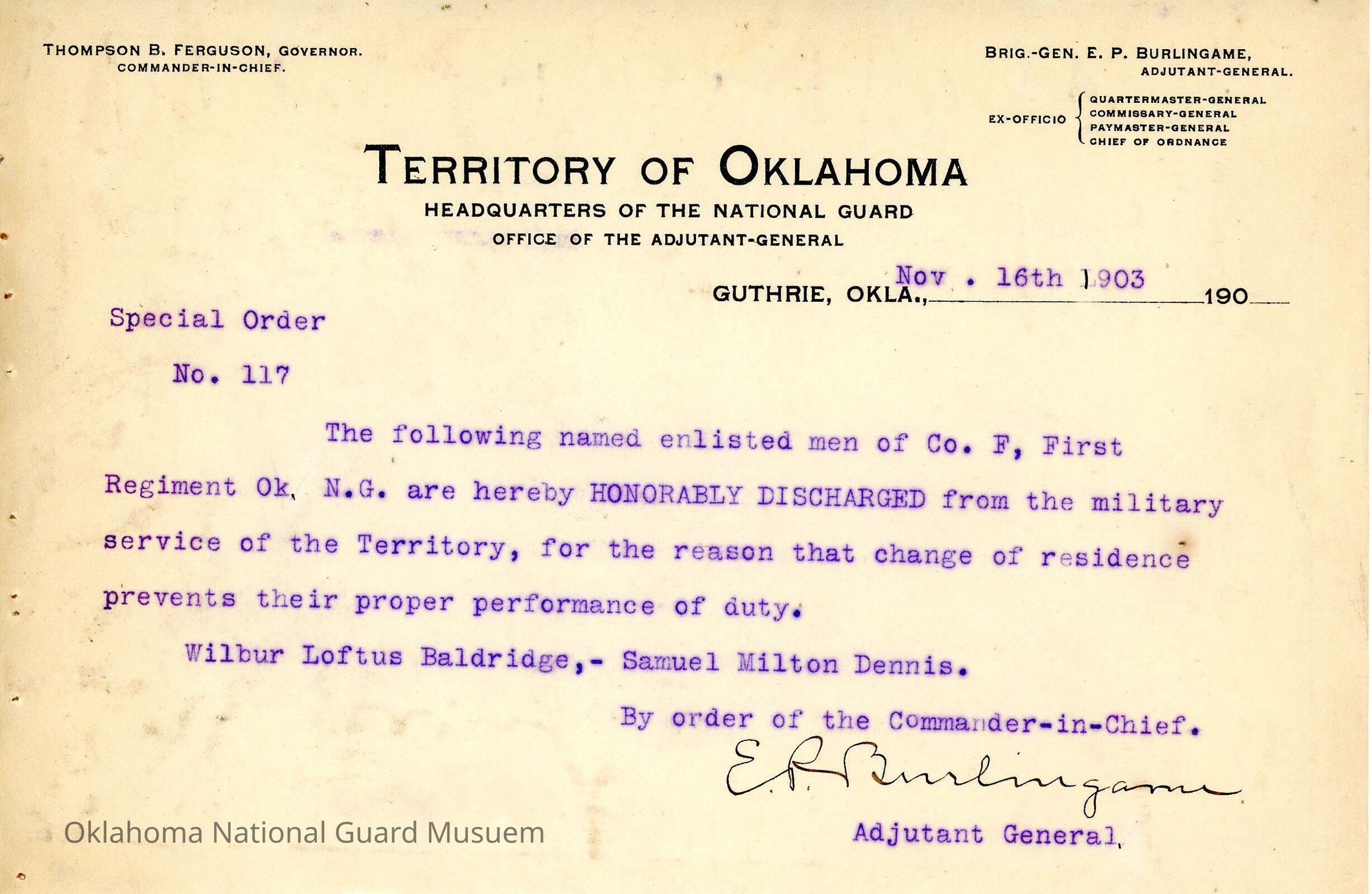 Adjutant General, Guthrie, E.P. Burlingame, Thompson B. Ferguson, First Regiment, Honorable discharges, Wilbur Loftus Baldridge, Samuel Milton Dennis