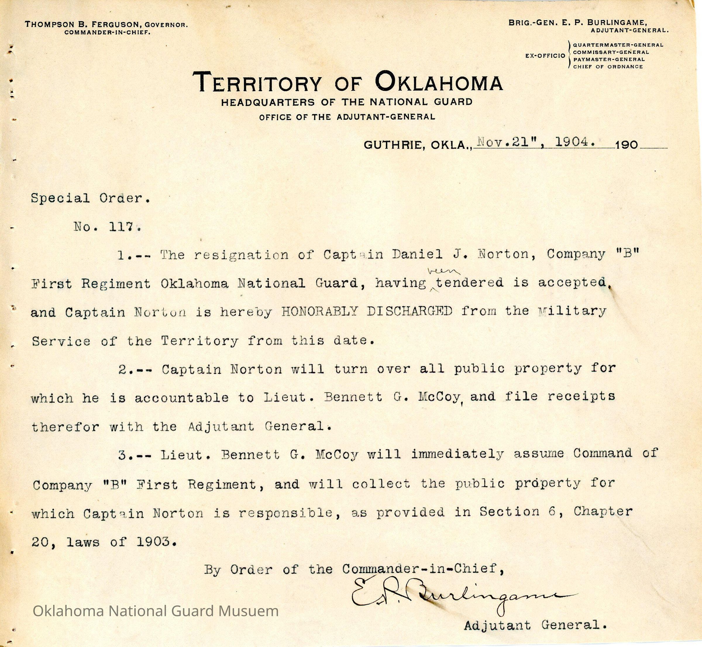Adjutant General, Guthrie, E.P. Burlingame, Thompson B. Ferguson, Honorable discharges, Resignation, Daniel J. Norton, Bennett G. McCoy, Property