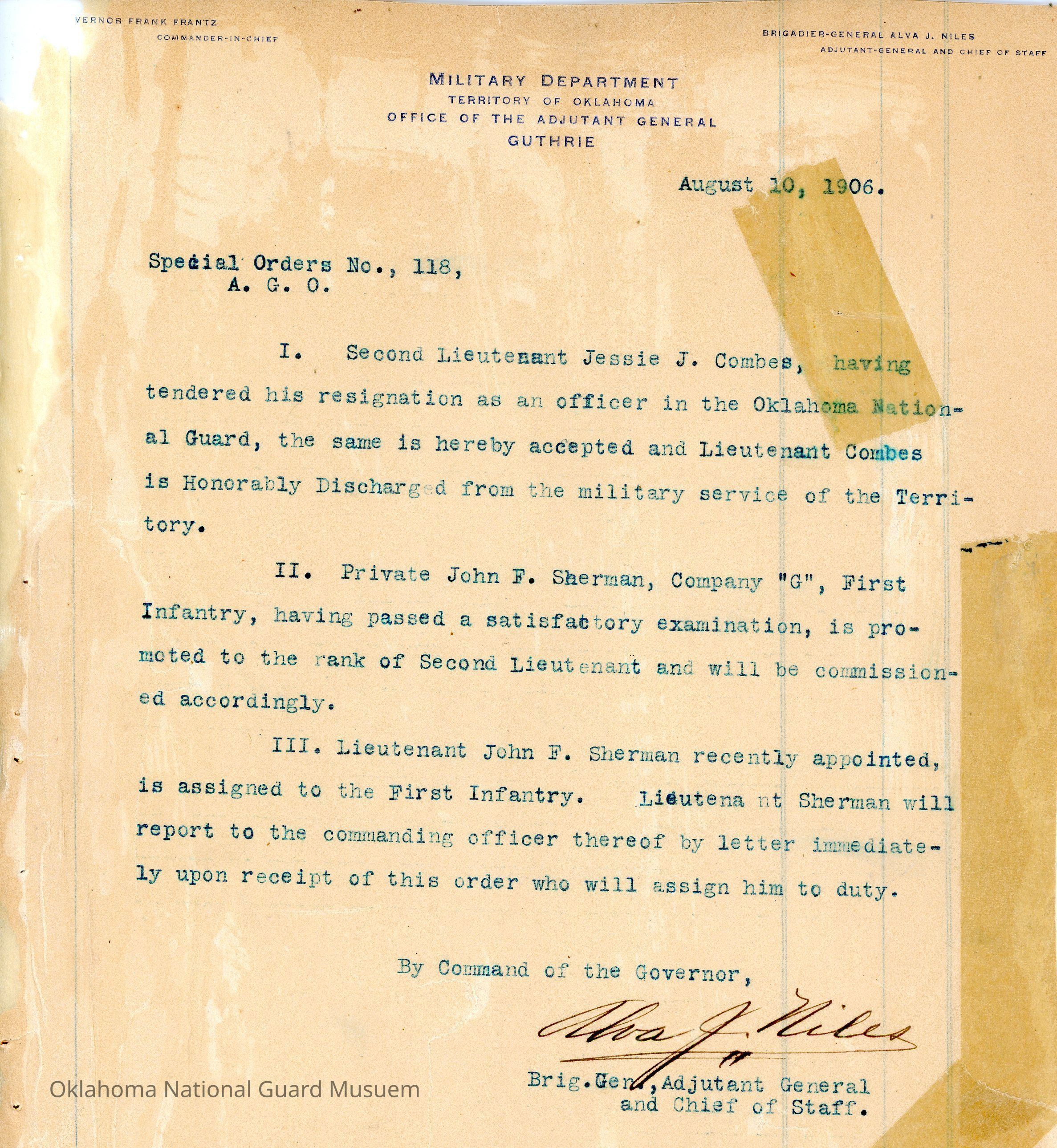 Adjutant General, Guthrie, Frank Frantz, Alva J. Niles, First Infantry, Honorable discharges, Resignation, Jessie J. Combes, John F. Sherman, Promotion