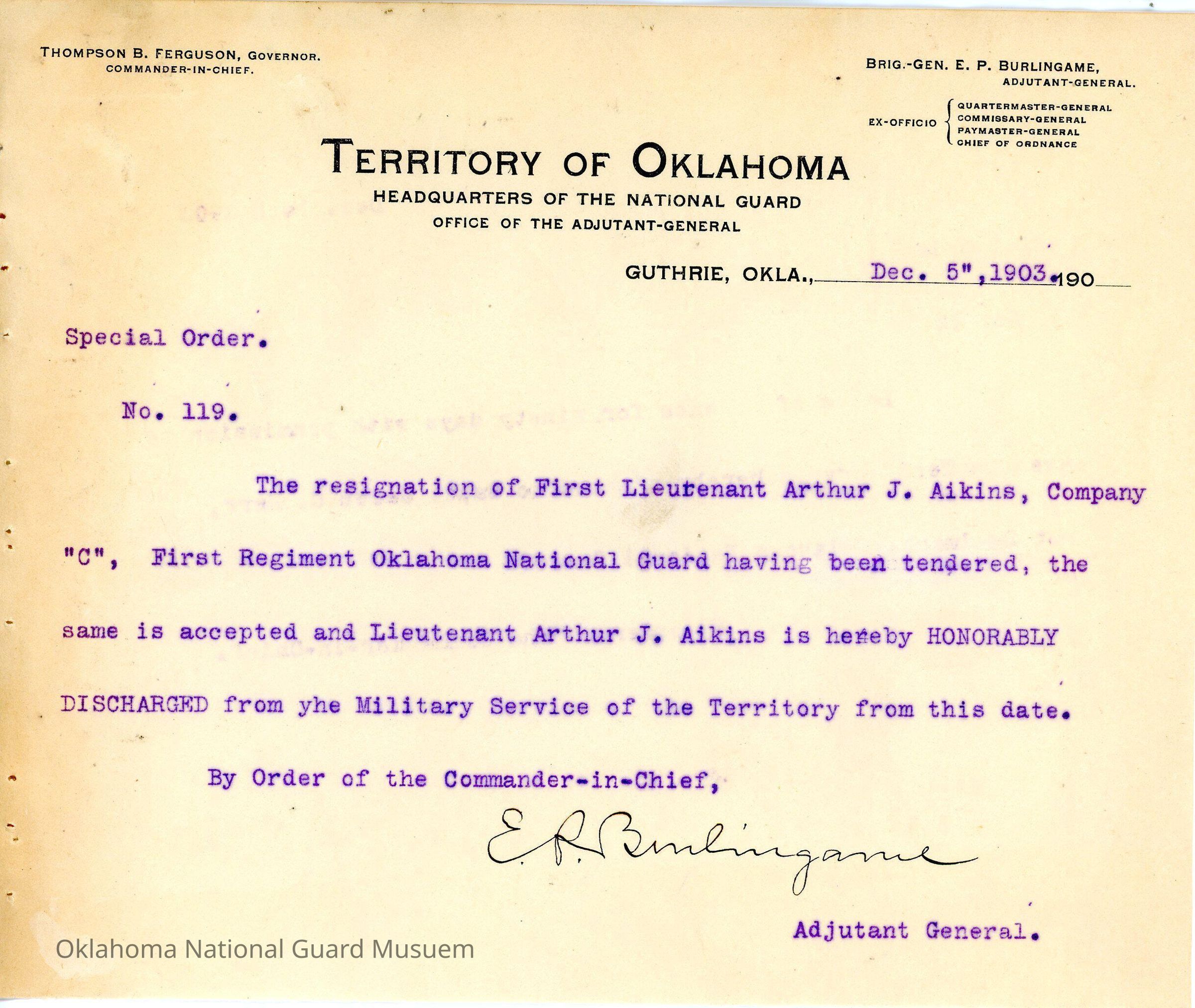 Adjutant General, Guthrie, E.P. Burlingame, Thompson B. Ferguson, First Regiment, Honorable discharges, Resignation, Arthur J. Aikins