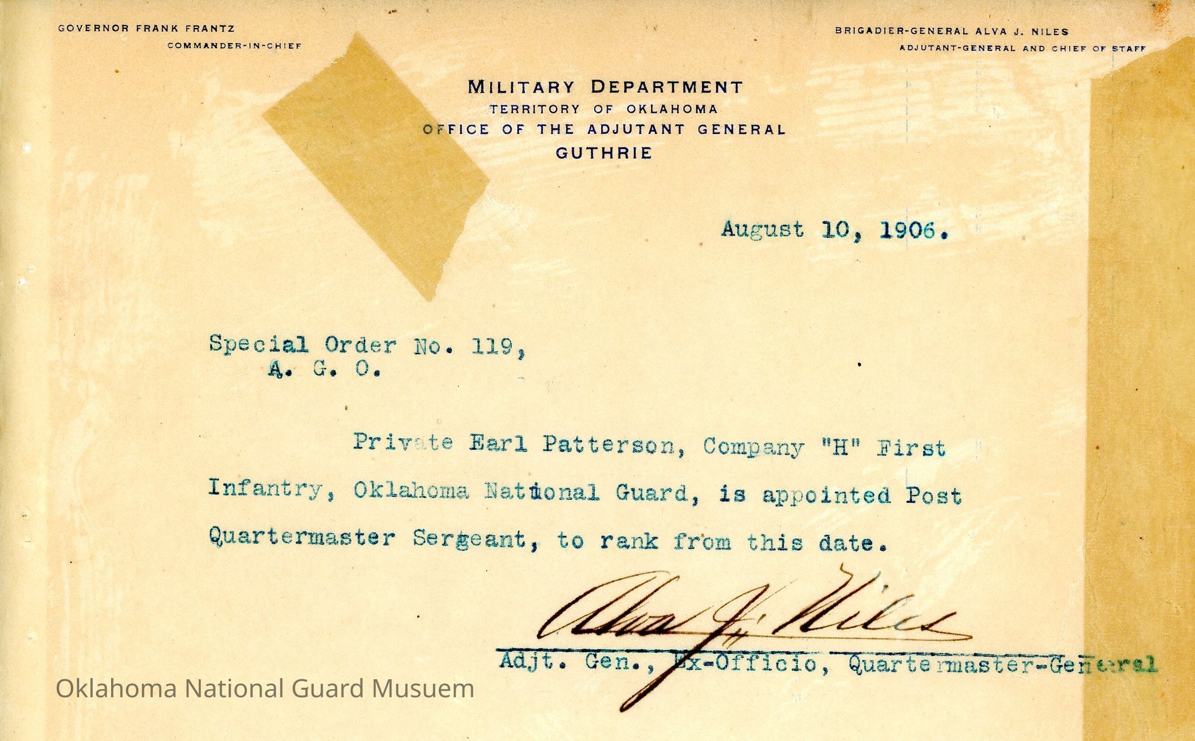 Special Order #119 from Headquarters Adjutant General's Office in Guthrie. The order appoints Earl Patterson to Post Quartermaster SergeantDate(s) of Creation