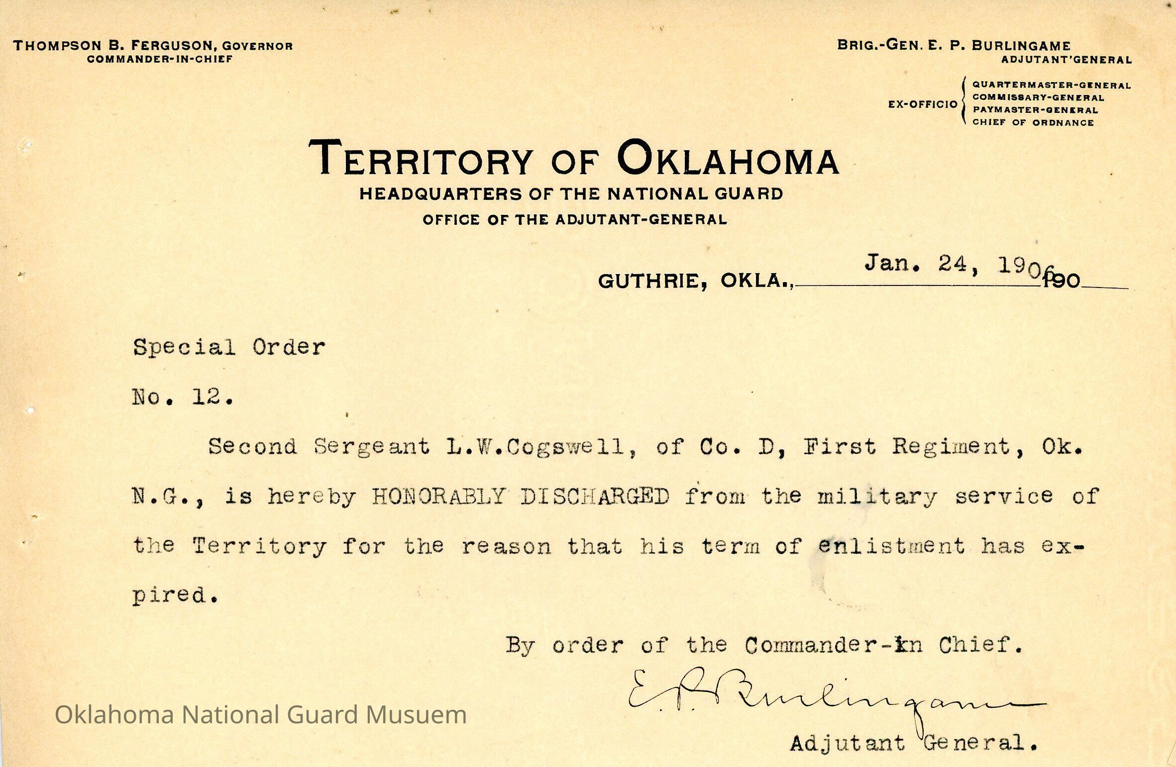 Adjutant General, Guthrie, E.P. Burlingame, Thompson B. Ferguson, First Regiment, Honorable discharges, L.W. Cogswell