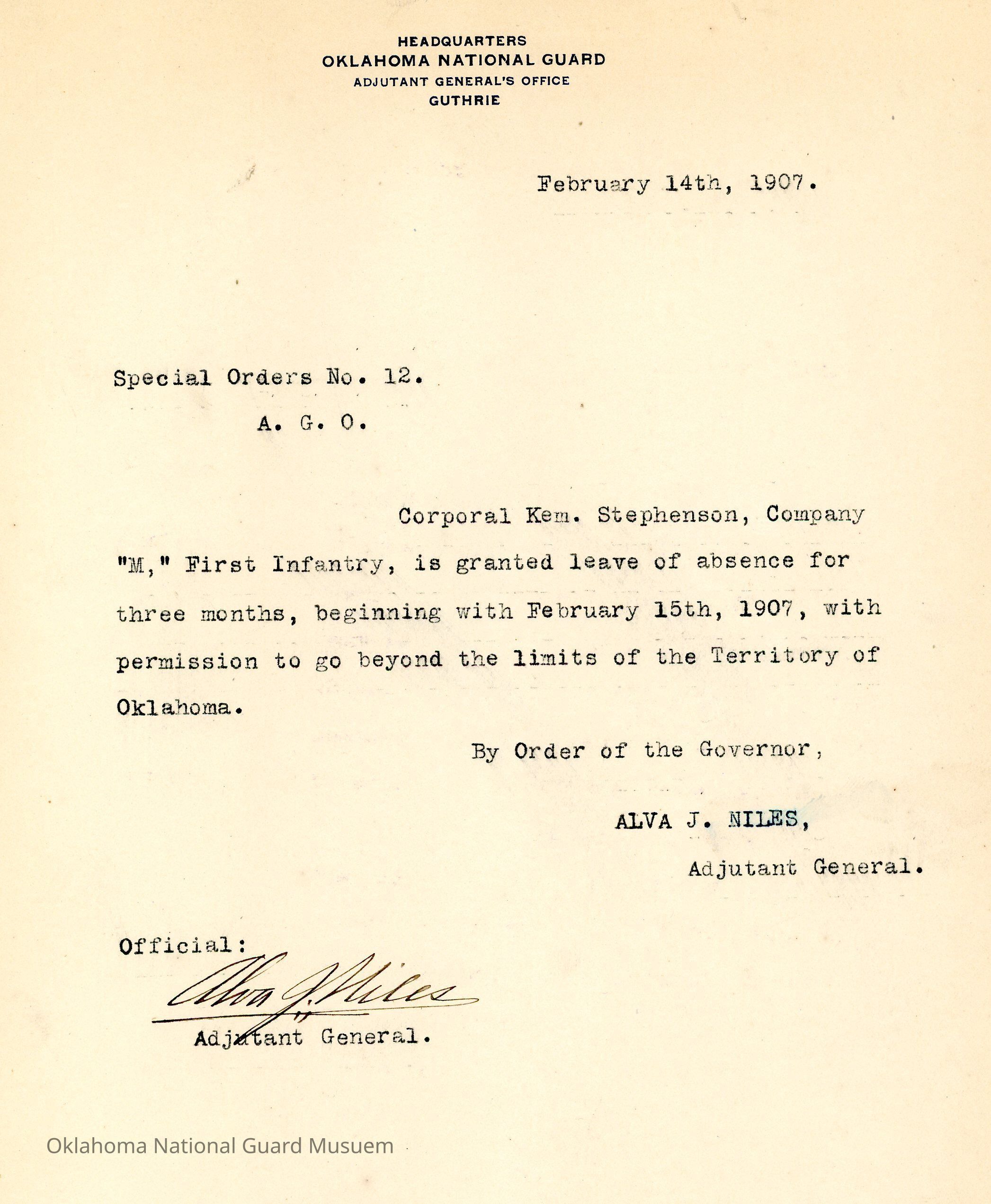 Special Order #12 from Headquarters Adjutant General's Office in Guthrie. The order grants a leave of absence to Kem Stephenson of Company M First InfantryDate(s) of Creation