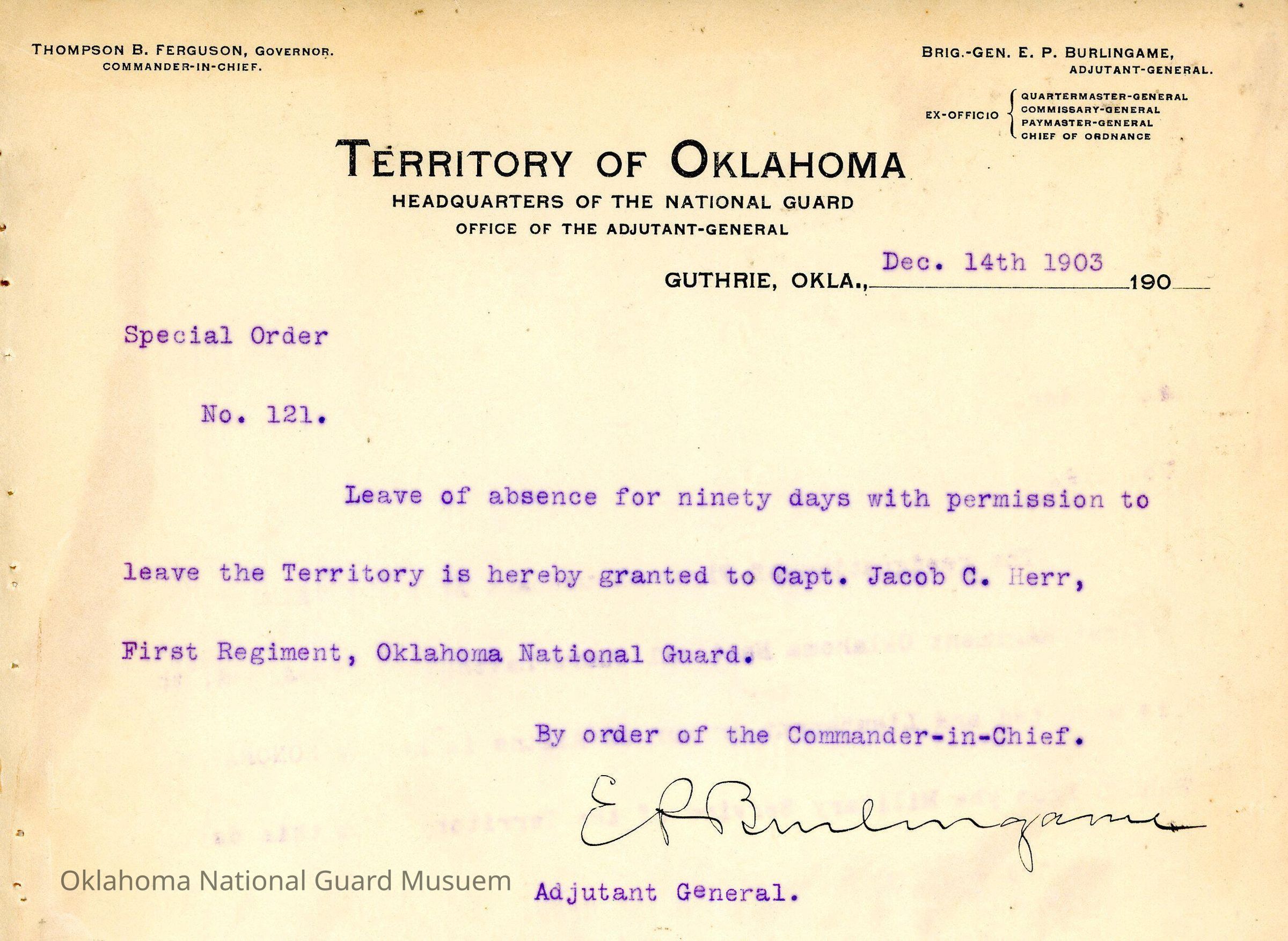 Adjutant General, Guthrie, E.P. Burlingame, Thompson B. Ferguson, Jacob C. Herr, Leave