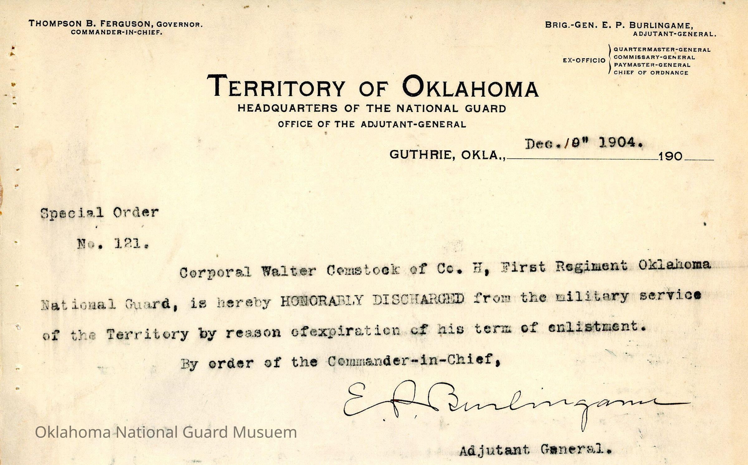 Adjutant General, Guthrie, E.P. Burlingame, Thompson B. Ferguson, Honorable discharges, Walter Comstock