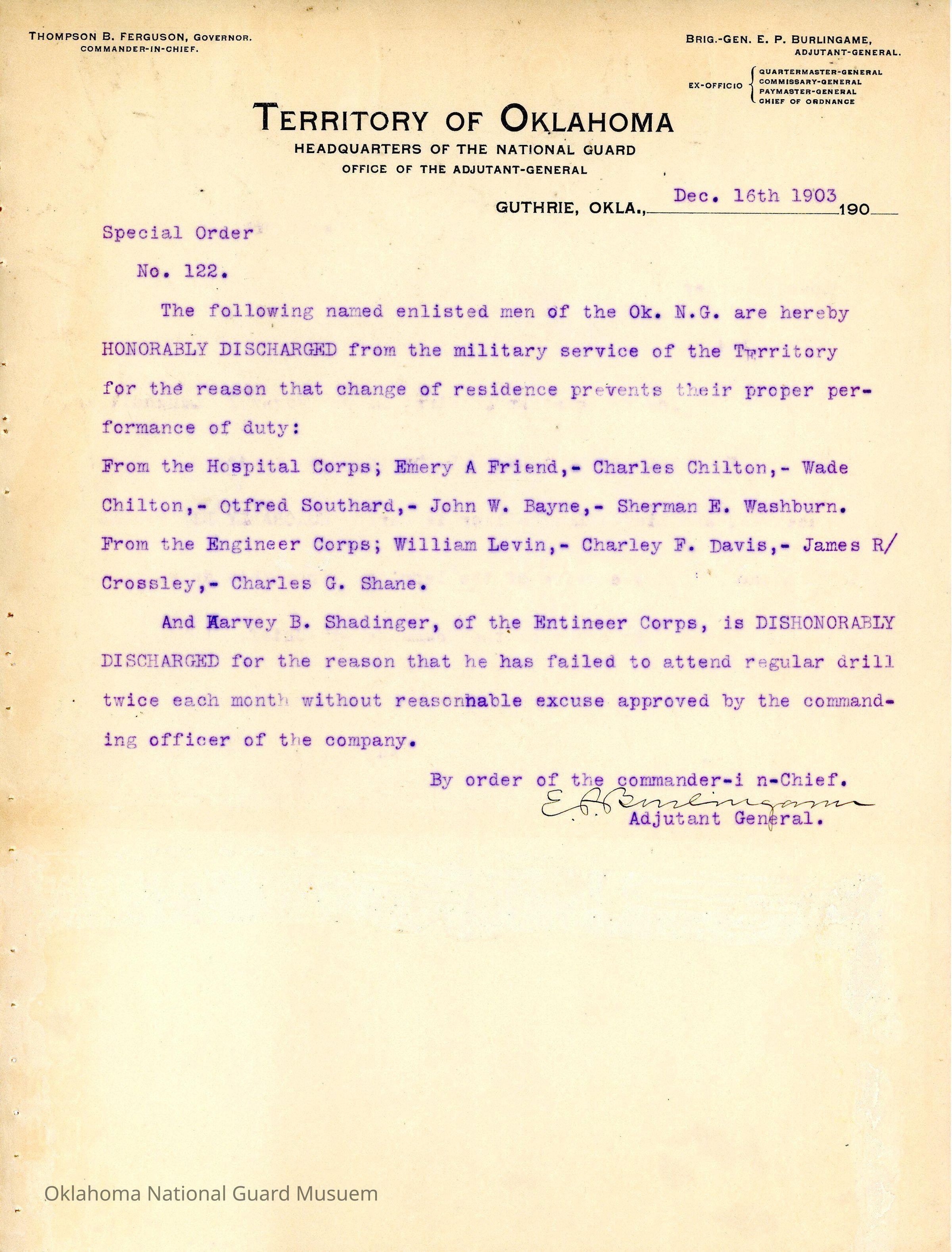 Special Order #122 from Headquarters Adjutant General's Office in Guthrie. The order notes the honorable discharges and dishonorable discharges in the Hospital Corps and the Engineer CorpsDate(s) of Creation