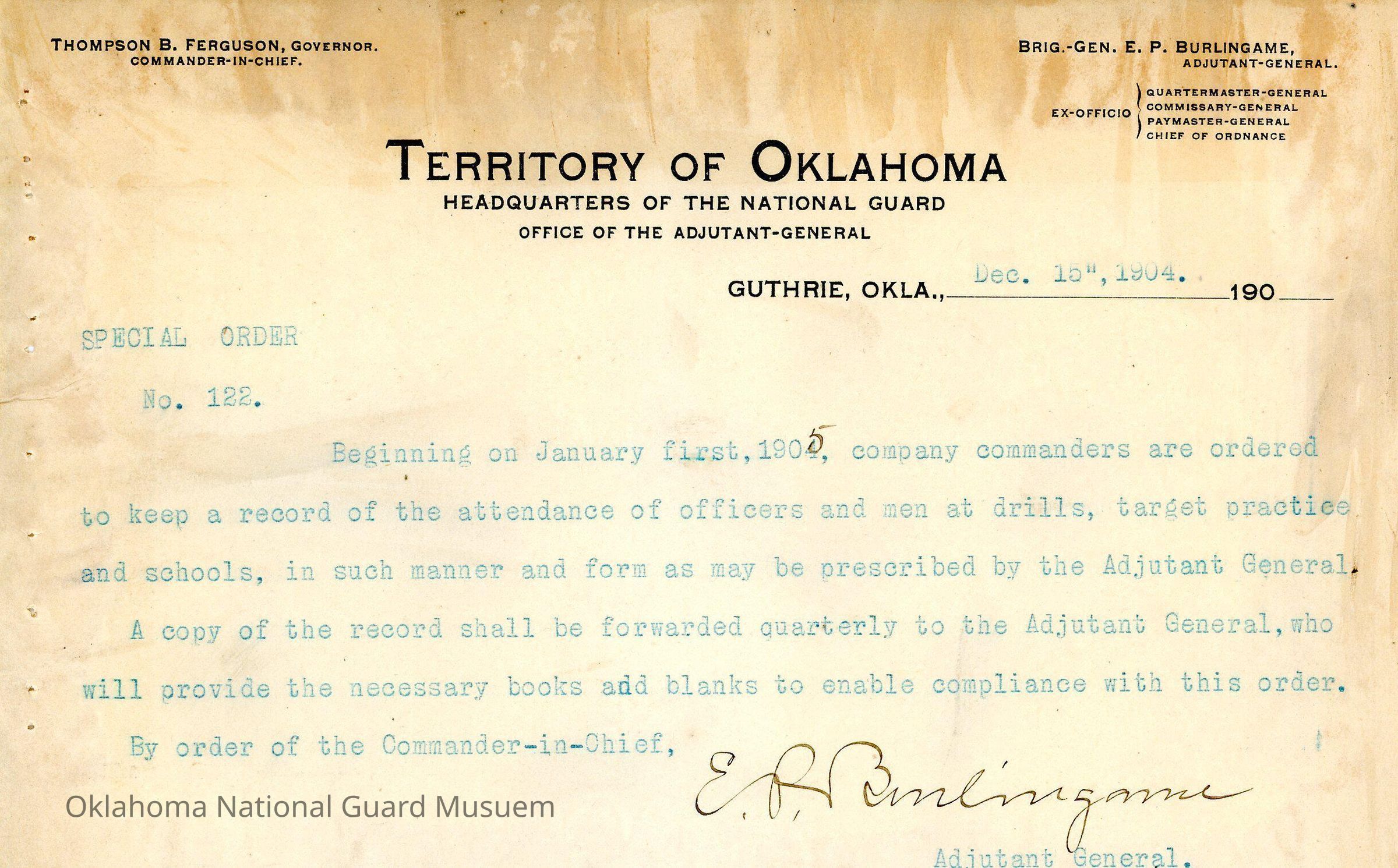 Adjutant General, Guthrie, E.P. Burlingame, Thompson B. Ferguson, Attendance, Record