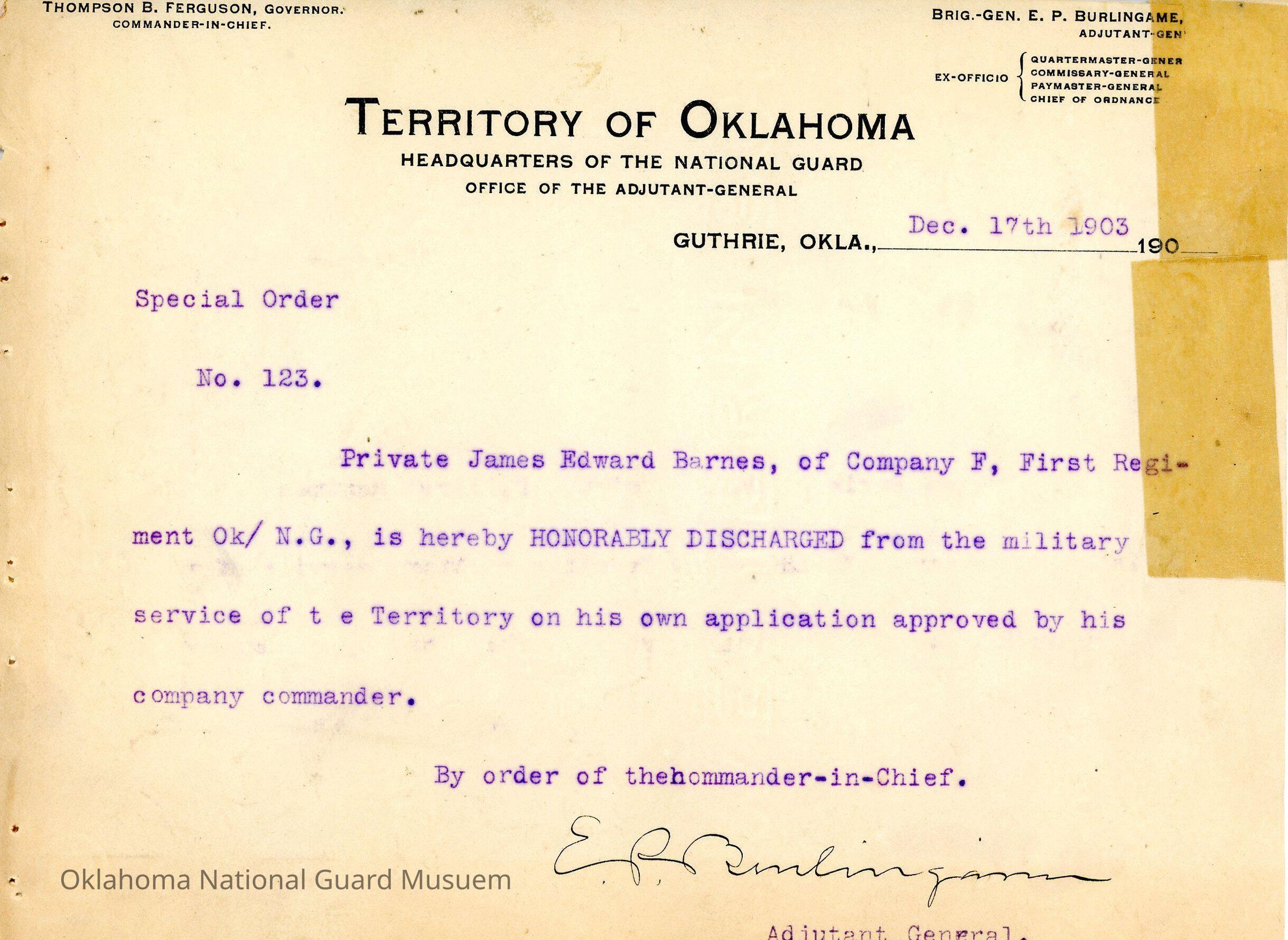 Adjutant General, Guthrie, E.P. Burlingame, Thompson B. Ferguson, First Regiment, Honorable discharges, James Edward Barnes