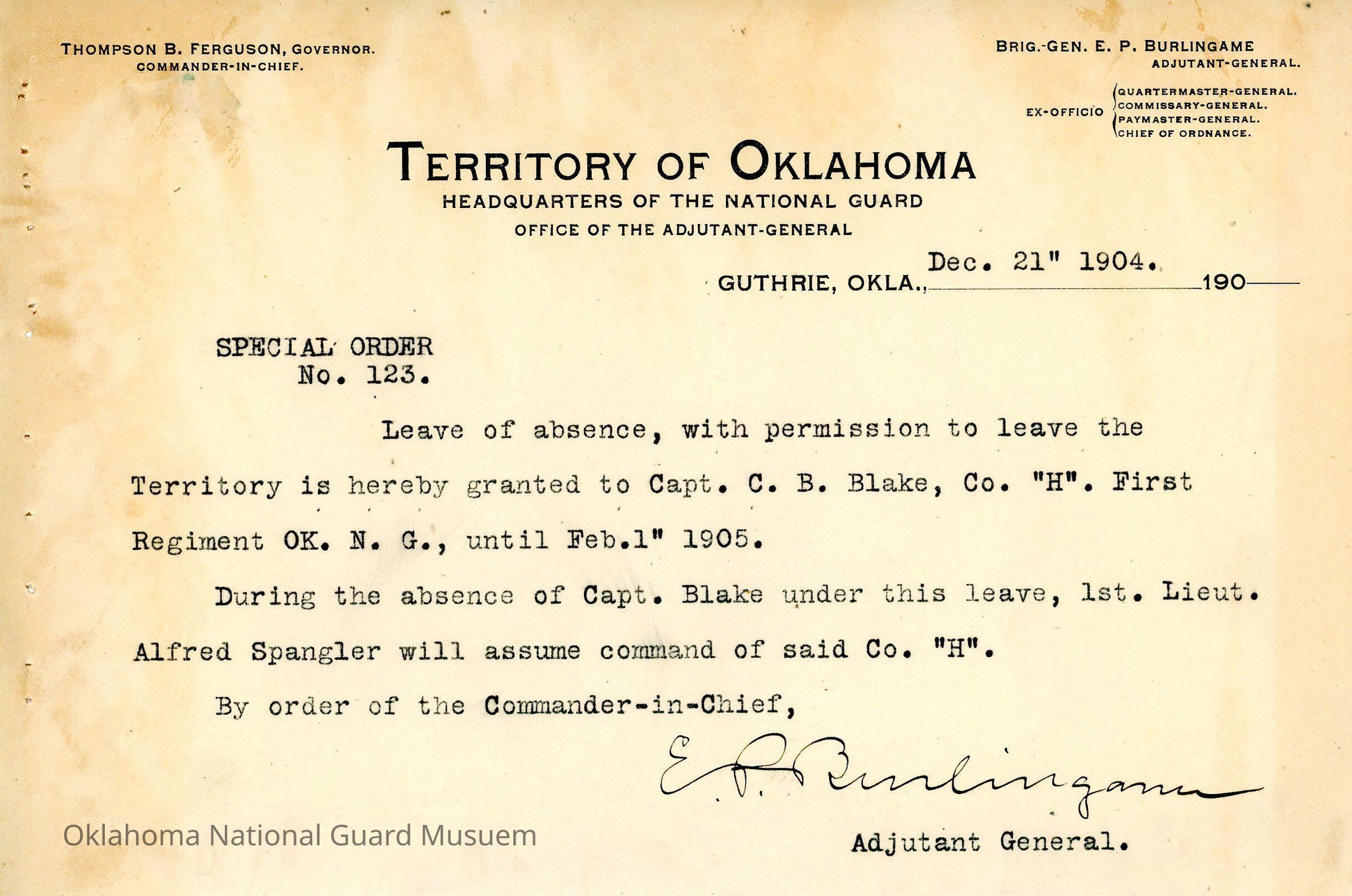 Special Order #123 from Headquarters Adjutant General's Office in Guthrie. The order grants a leave of absence to C.B. BlakeDate(s) of Creation