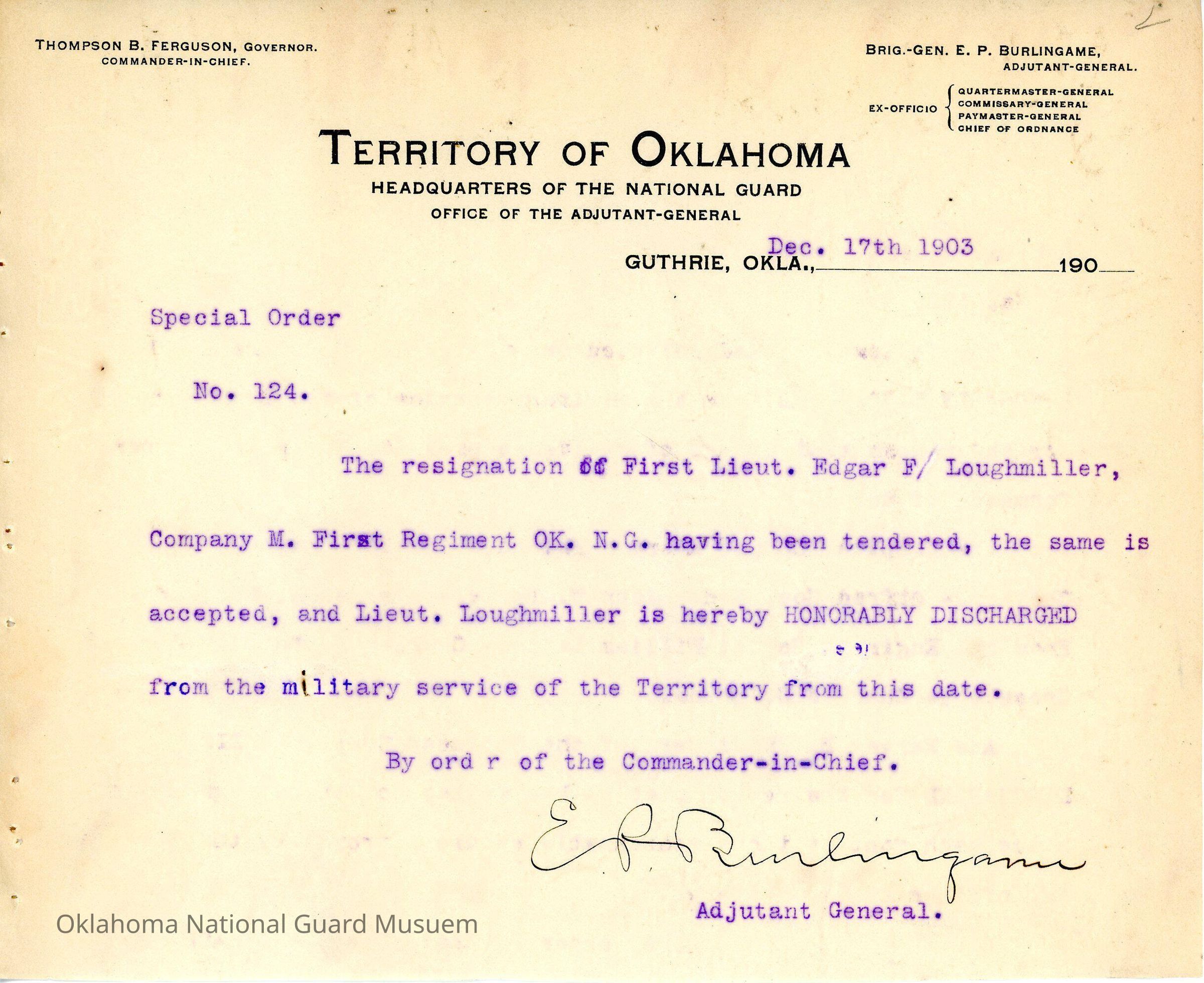 Adjutant General, Guthrie, E.P. Burlingame, Thompson B. Ferguson, First Regiment, Honorable discharges, Edgar F. Loughmiller
