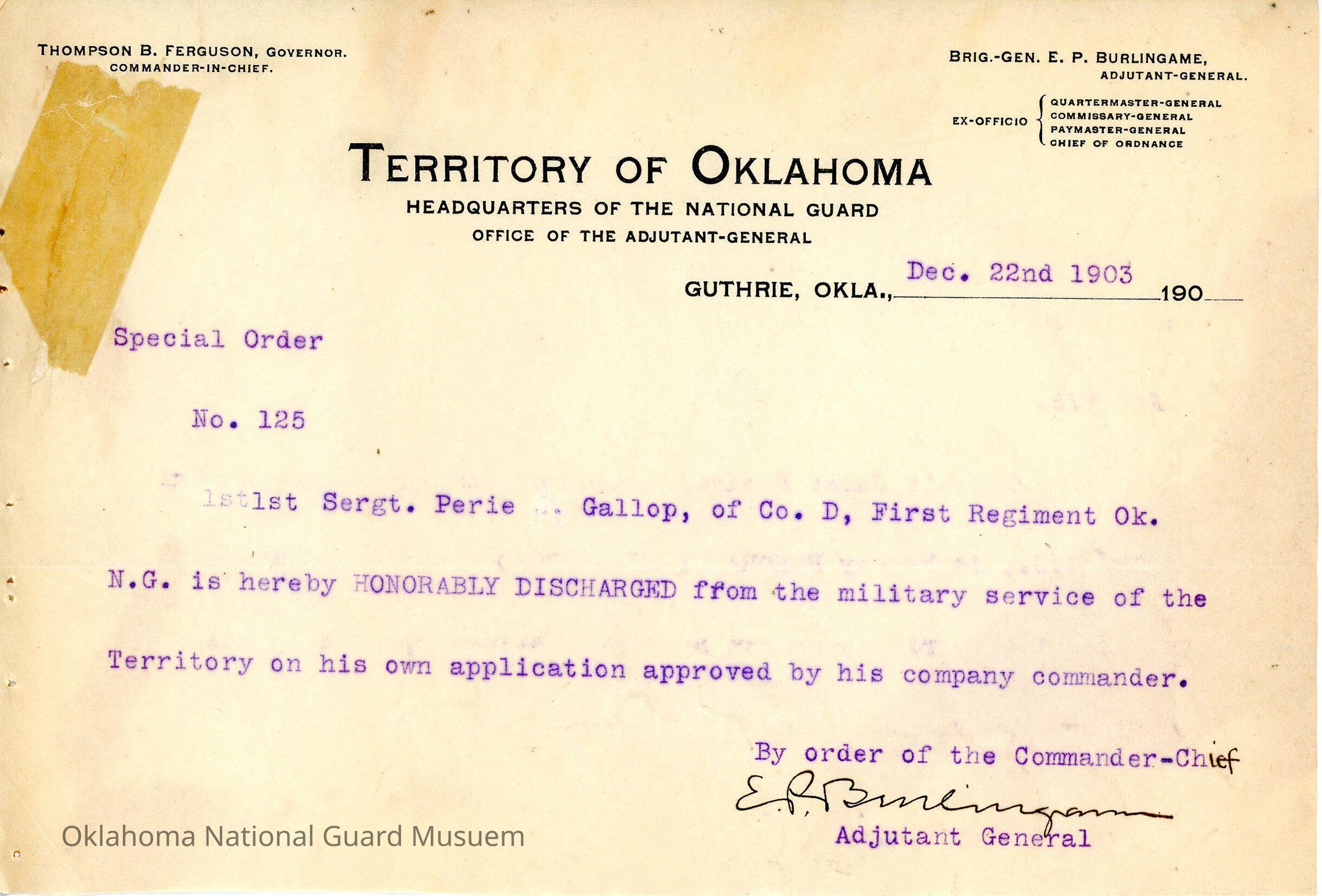Adjutant General, Guthrie, E.P. Burlingame, Thompson B. Ferguson, First Regiment, Honorable discharges, Perie S. Gallop