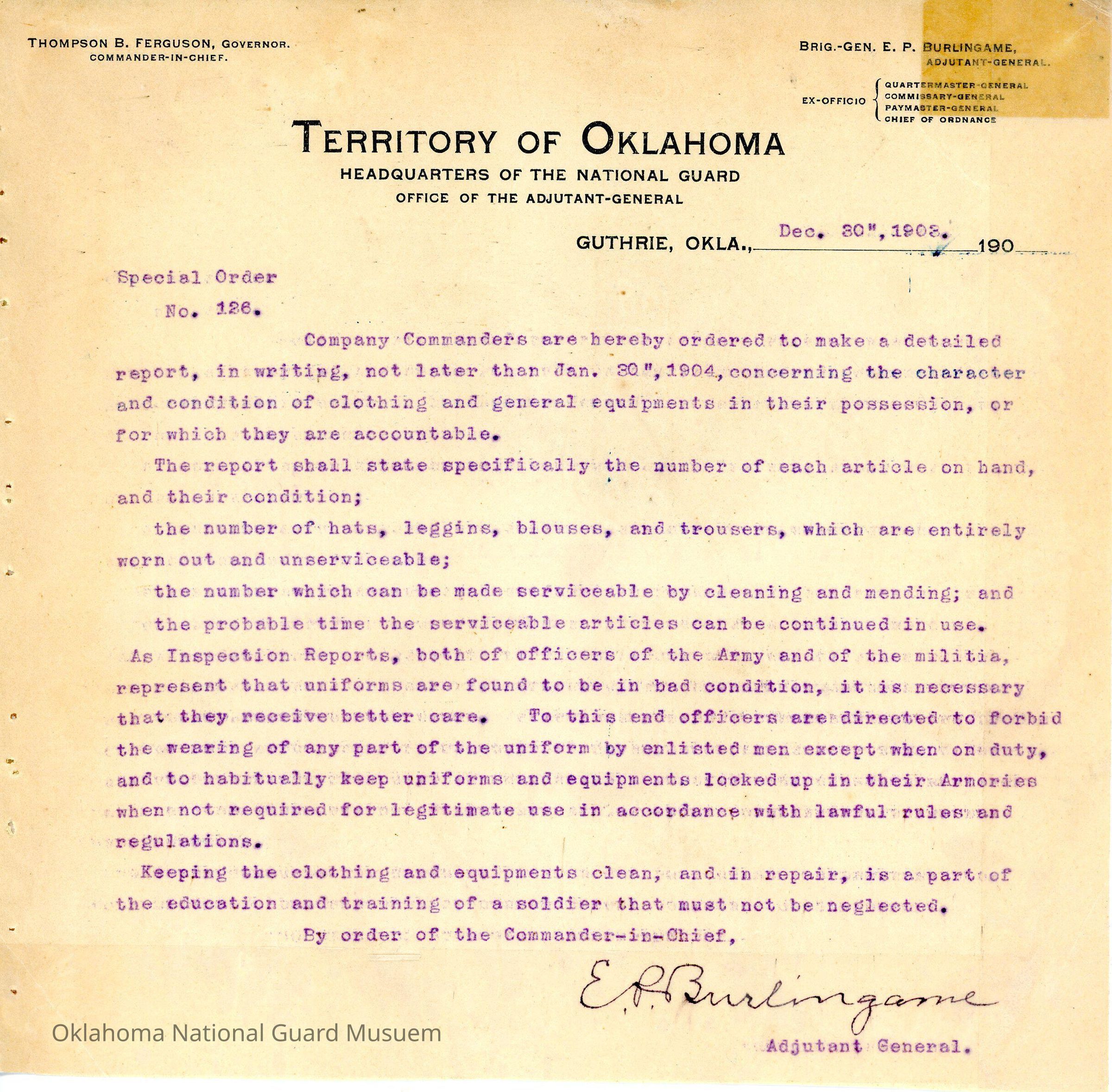 Special Order #126 from Headquarters Adjutant General's Office in Guthrie. The order instructs company commanders to make a detailed list of clothing and general equipment in their possession and what they are accountable forDate(s) of Creation