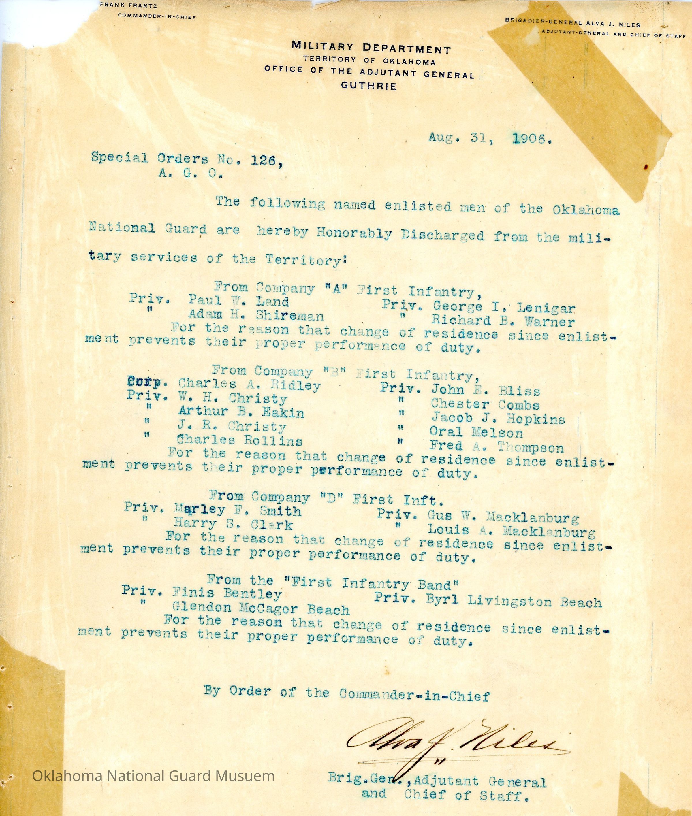 Adjutant General, Guthrie, Frank Frantz, Alva J. Niles, First Infantry, Honorable discharges, First Infantry Band, Paul W. Land, Adam H. Shireman, George I. Lenigar, Richard B. Warner, Charles A. Ridley, W.H. Christy, Arthur B. Eakin, J.R. Christy, Charles Rollins, John E. Bliss, Chester Combs, Jacob J. Hopkins, Oral Melson, Fred A. Thompson, Marley F. Smith, Harry S. Clark, Gus Macklanburg, Louis Macklanburg, Finis Bentley, Glendon McCagor Beach, Byril Livingston Beach