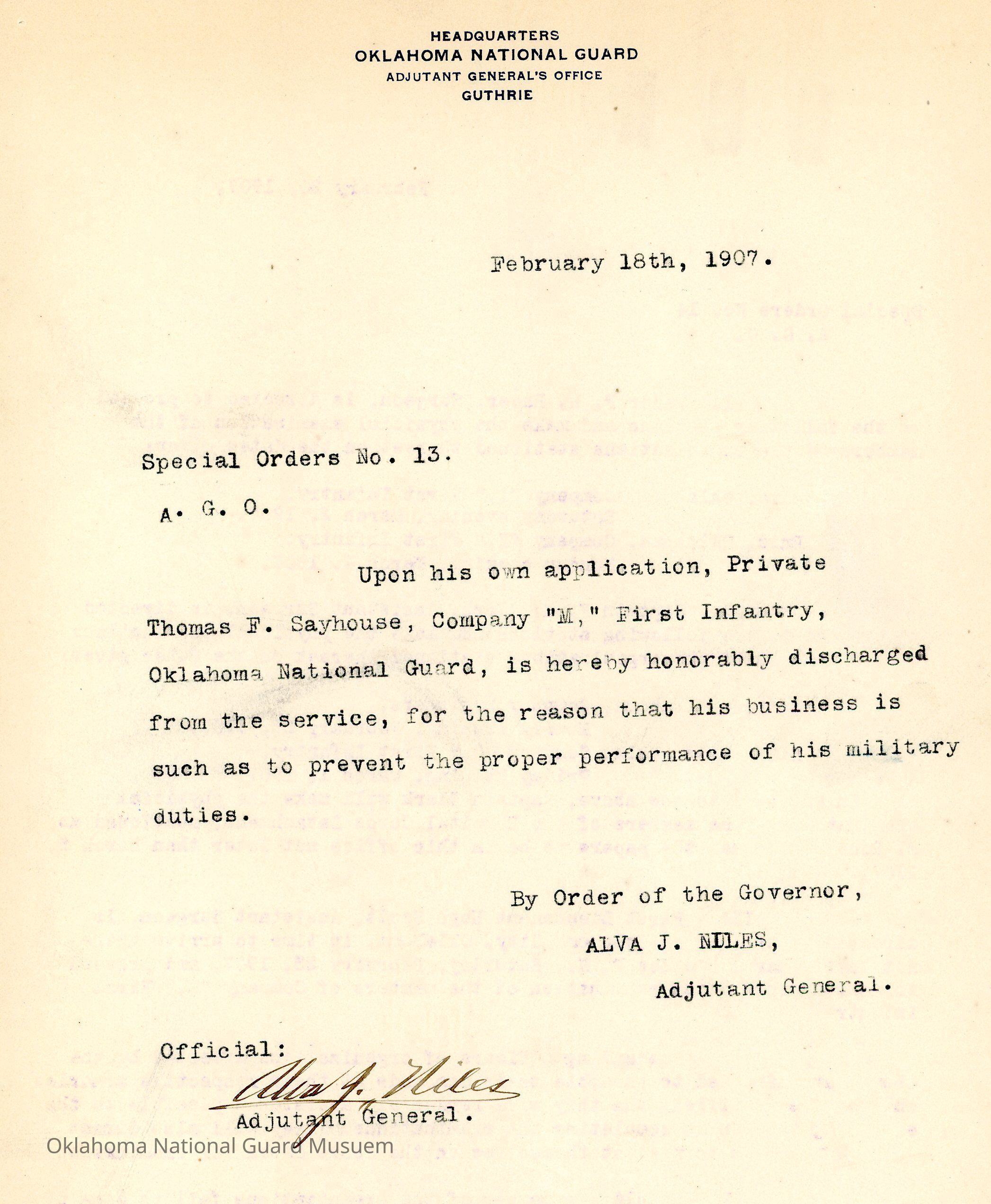 Adjutant General, Guthrie, Alva J. Niles, Honorable discharges, First Infantry, Thomas F. Sayhouse