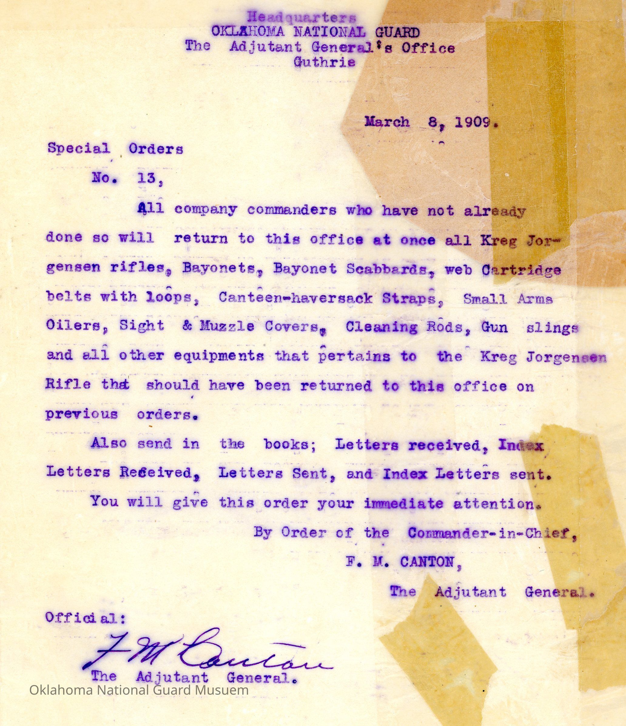 Special Order #13 from Headquarters Adjutant General's Office in Guthrie. The order instructs all company commanders to pack up and ship to the Adjutant General all Kreg Jorgensen Rifles, gun slings, bayonets, scabbards, loop belts, and all other equipment related to the Kreg JorgensenDate(s) of Creation