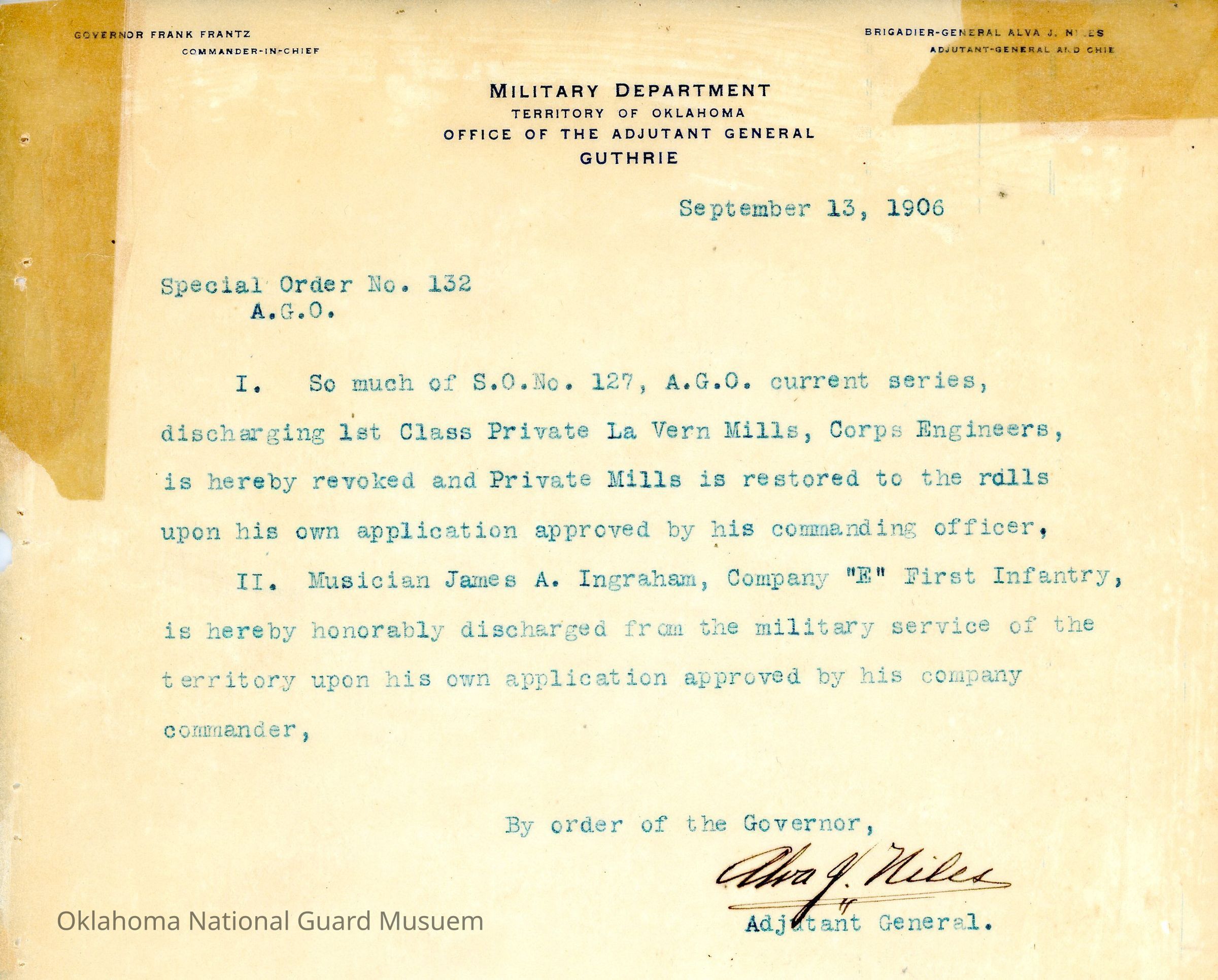 Special Order #132 from Headquarters Adjutant General's Office in Guthrie. The order rescinds Special Order #127 1906 that pertains to the discharge of La Vern Mills. This order also honorably discharges James A. IngrahamDate(s) of Creation