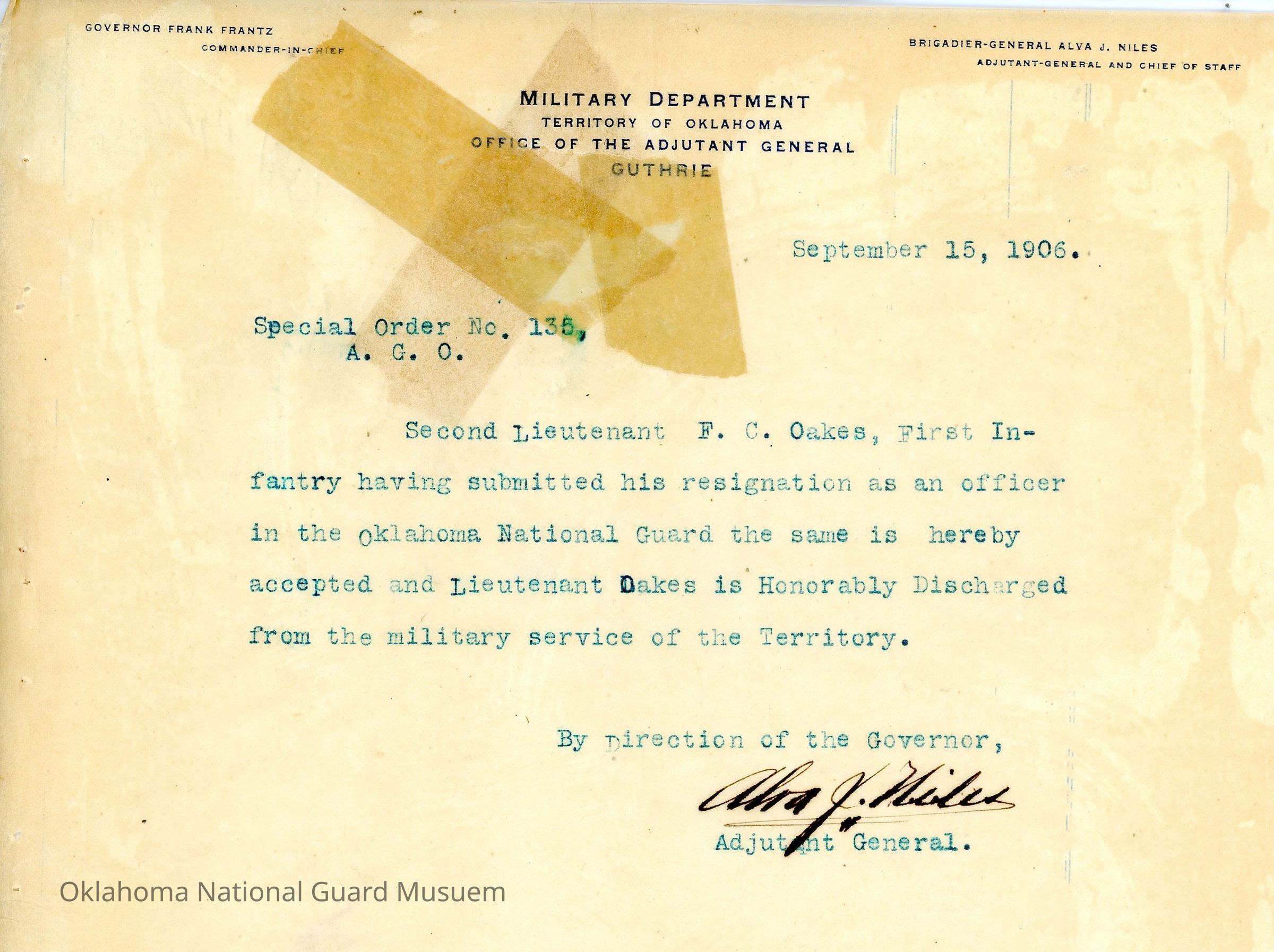 Adjutant General, Guthrie, Frank Frantz, Alva J. Niles, Honorable discharges, Resignation, F.C. Oakes