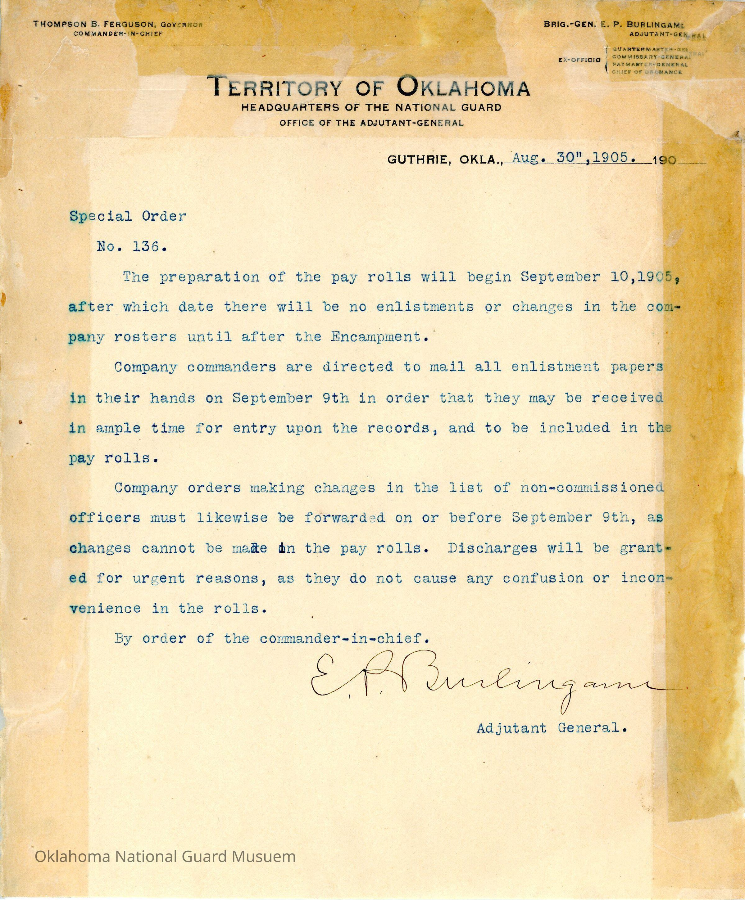 Special Order #136 from Headquarters Adjutant General's Office in Guthrie. The order halts all new enlistments after September 10, 1905 to prepare the payrollsDate(s) of Creation