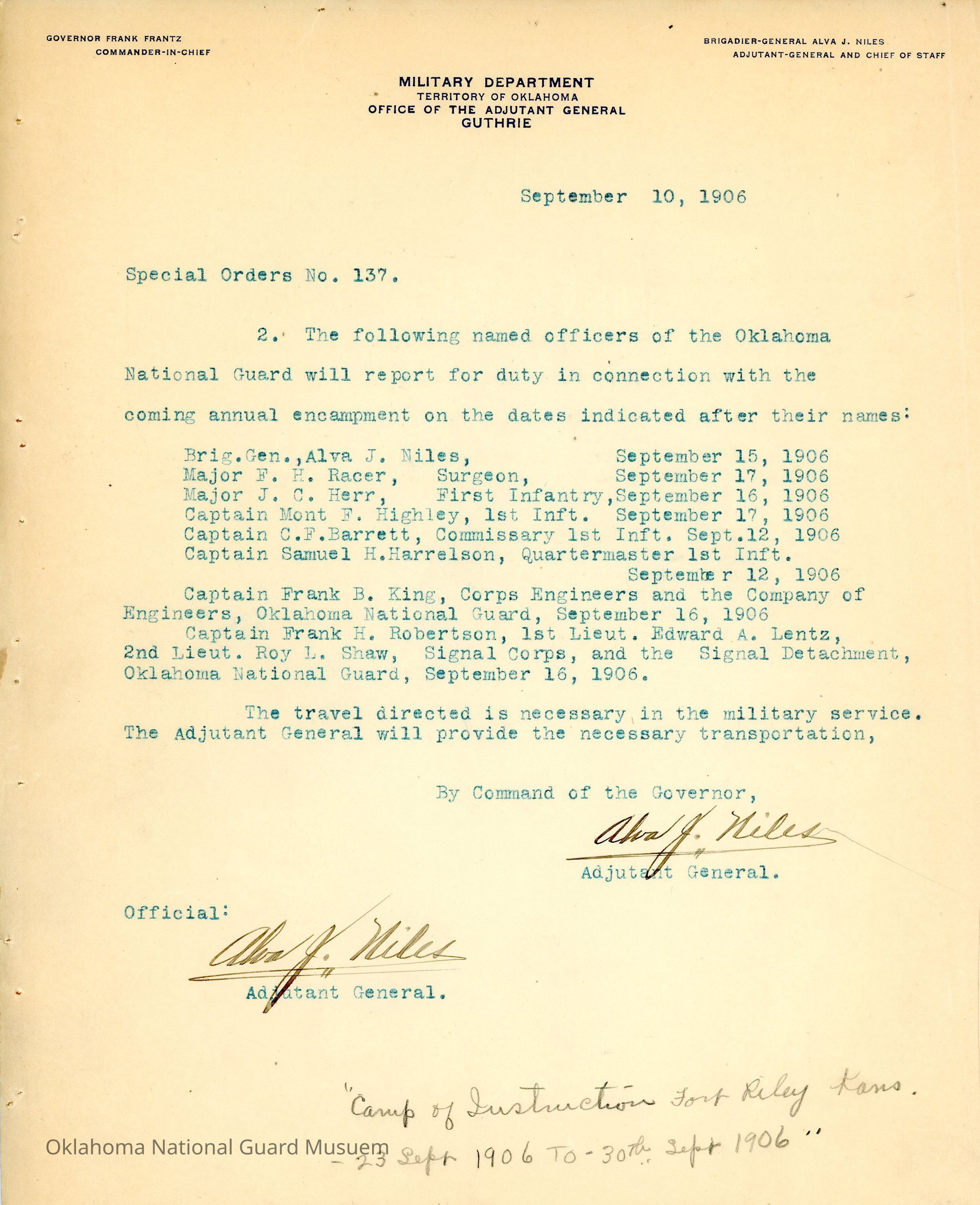 Special Order #137 from Headquarters Adjutant General's Office in Guthrie. The order lists the officers and the dates they will report to the annual encampment at Fort Riley, Kansas.Date(s) of Creation