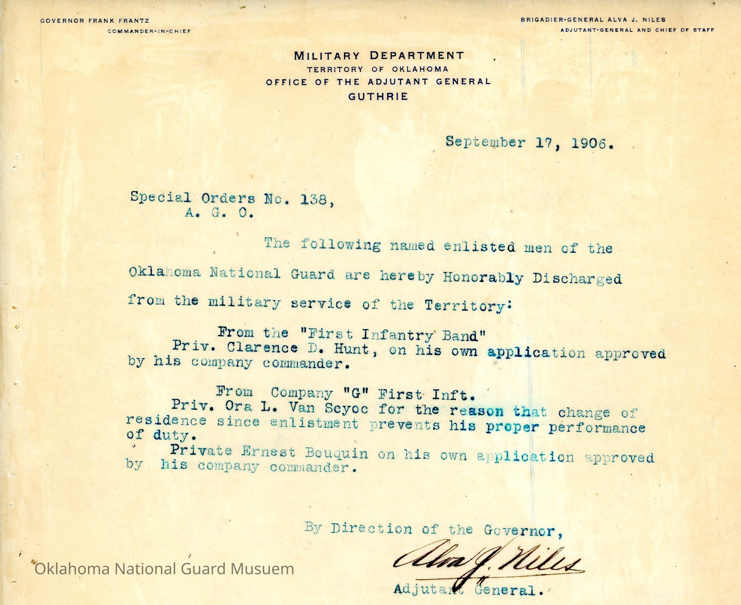 Adjutant General, Guthrie, Frank Frantz, Alva J. Niles, First Infantry, Honorable discharges, First Infantry Band, Clarence D. Hunt, Ora L. Van Scyoc, Ernest Bouquin