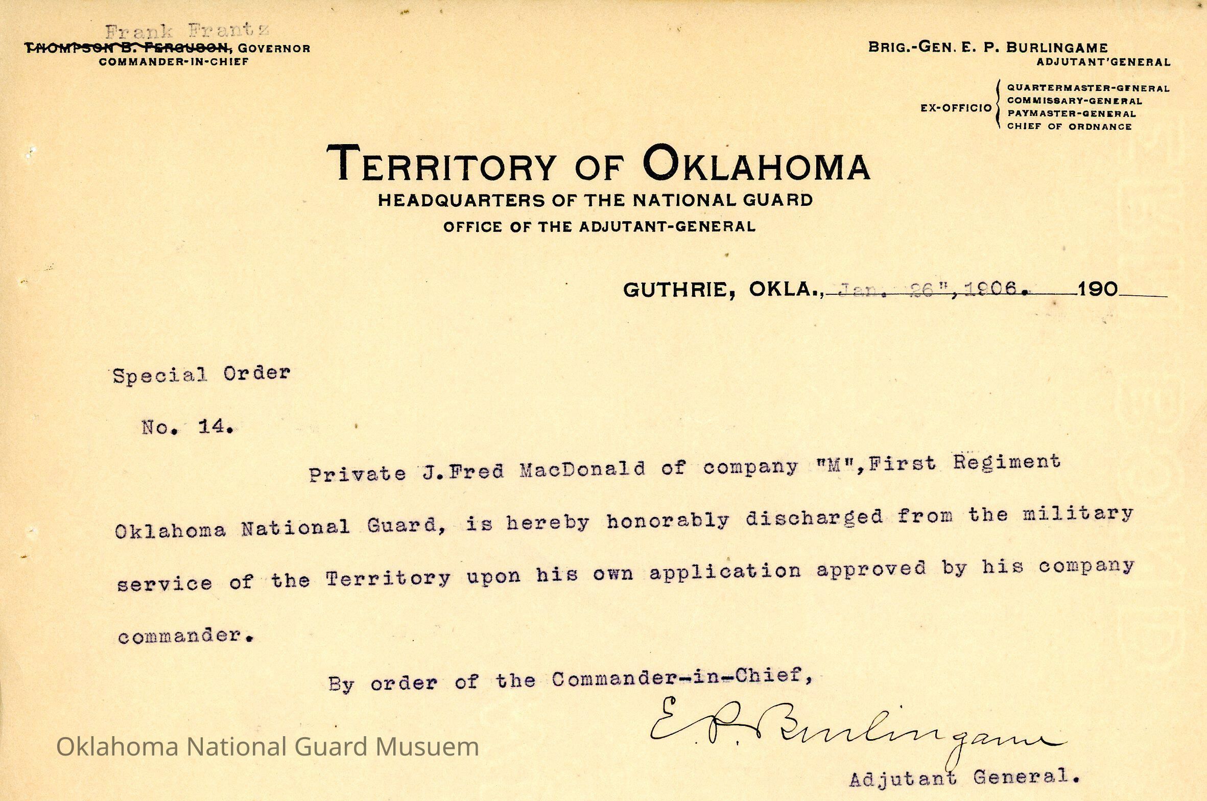 Adjutant General, Guthrie, E.P. Burlingame, Frank Frantz, First Regiment, Honorable discharges, J. Fred MacDonald