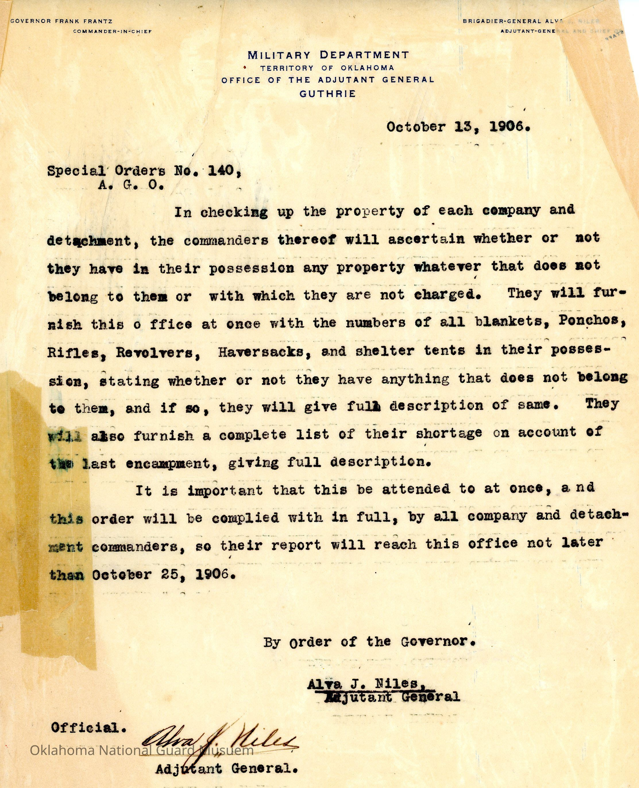 Adjutant General, Guthrie, Frank Frantz, Alva J. Niles, Inventory, Property, List