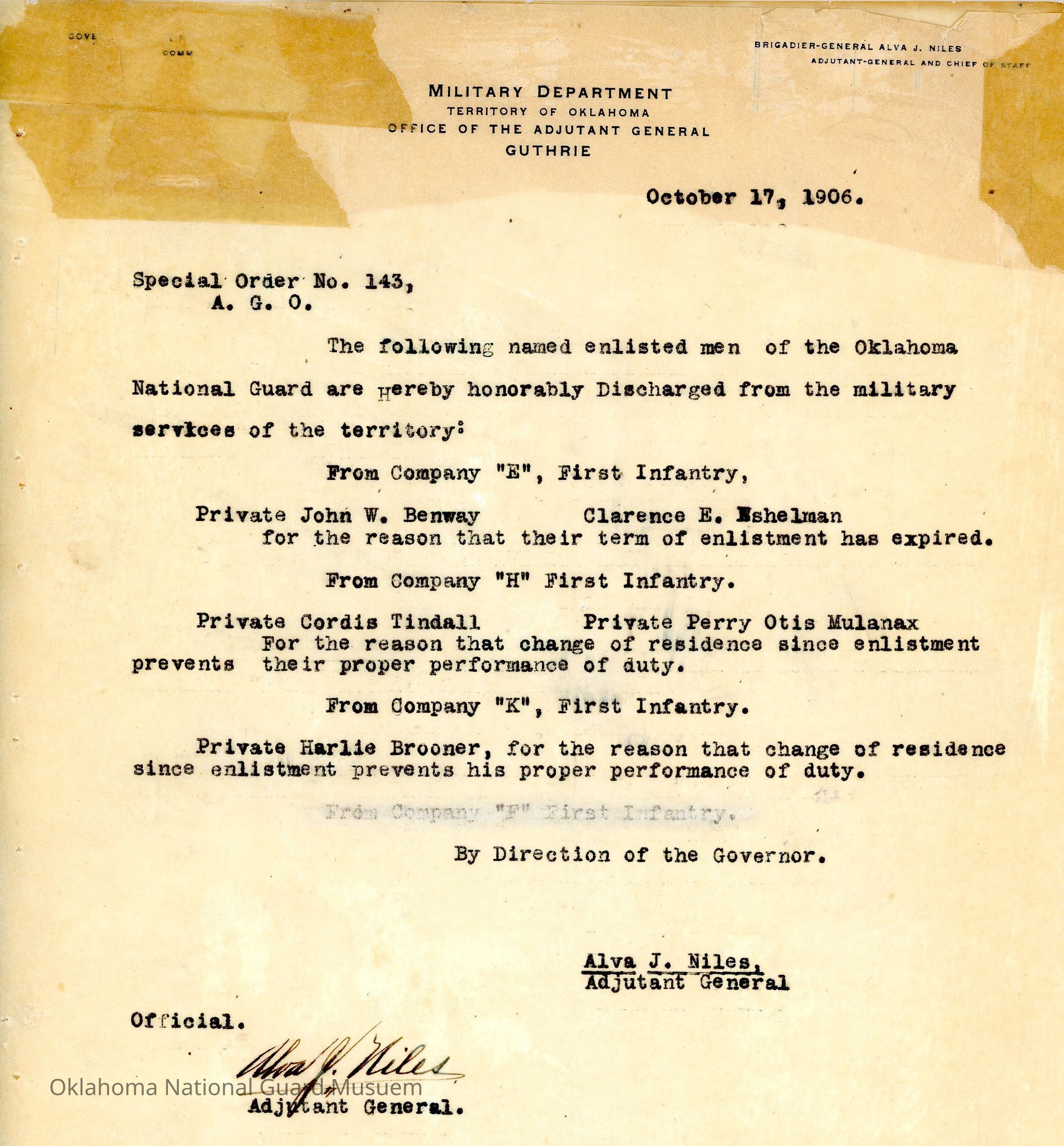 Adjutant General, Guthrie, Frank Frantz, Alva J. Niles, First Infantry, Honorable discharges, John W. Benway, Clarence E. Eshelman, Cordis Tindall, Perry Otis Mulanax, Harlie Brooner