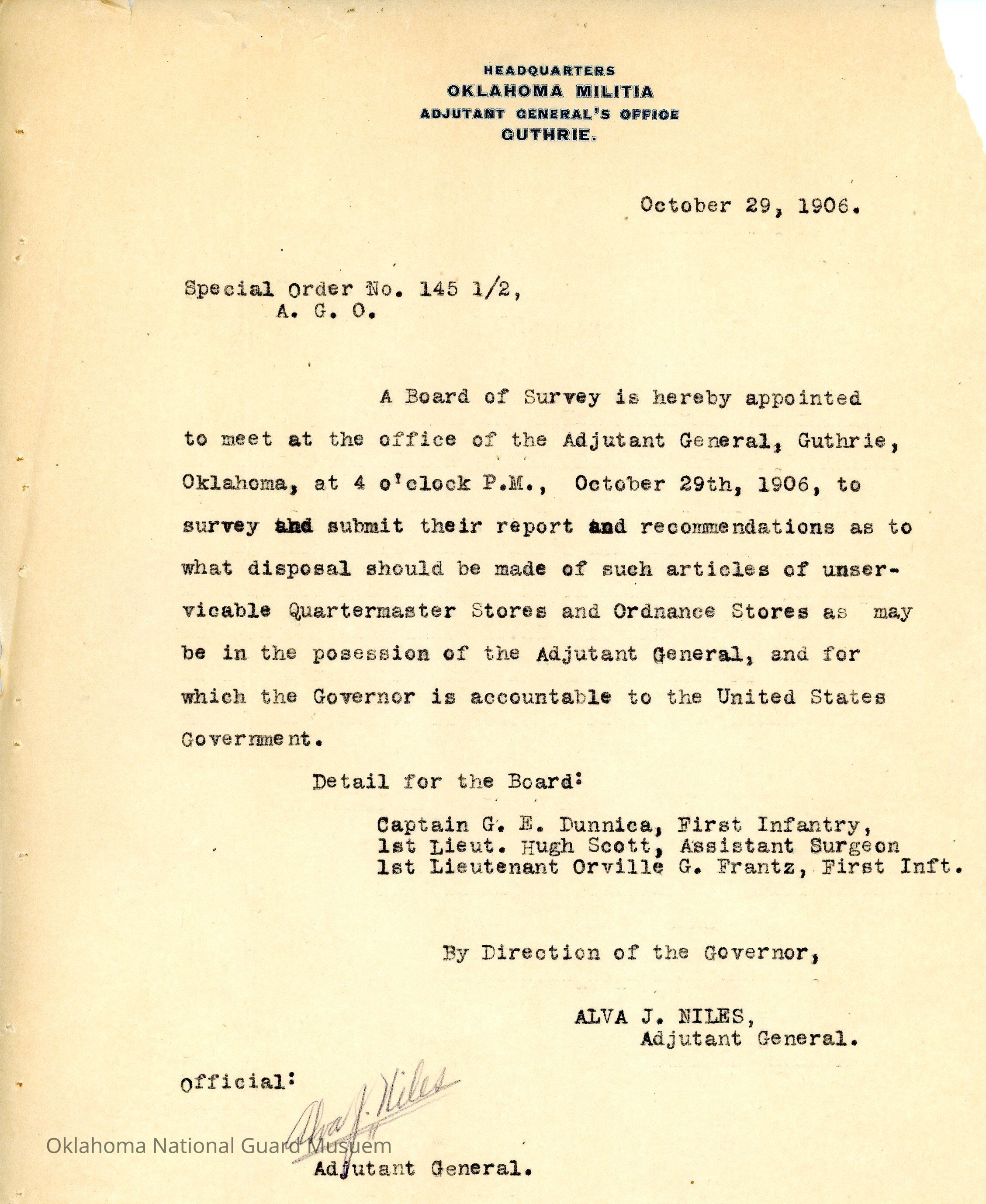 Special Order #145.5 from Headquarters Adjutant General's Office in Guthrie. The order appoints a Board of Survey to investigate all matters relating to public property issued by the federal government for use in the Oklahoma National Guard.Date(s) of Creation
