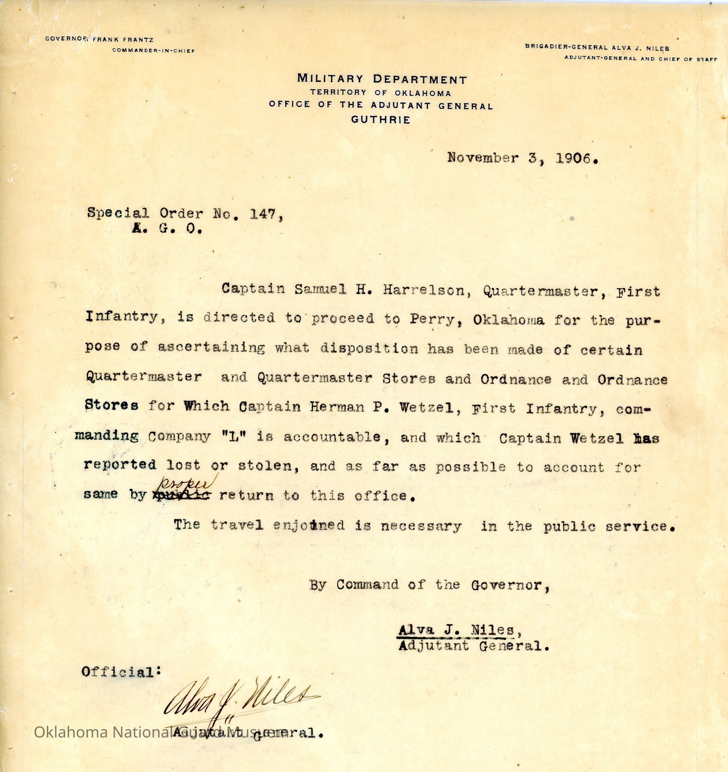 Special Order #147 from Headquarters Adjutant General's Office in Guthrie. The order instructs Samuel H. Harrelson to travel to Perry to check the report of lost or stolen property reported by Herman P. WetzelDate(s) of Creation