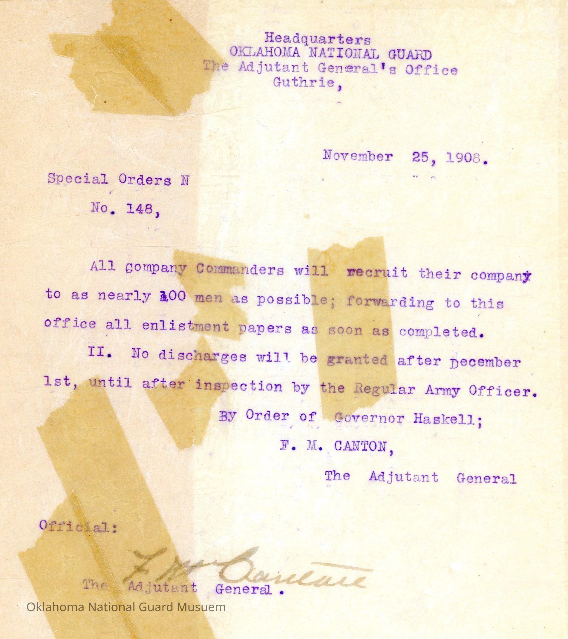 Special Order #148 from Headquarters Adjutant General's Office in Guthrie. The order instructs all company commanders to recruit their company to as close to one hundred men as possible and no discharges will be allowed until after inspection by a Regular Army officerDate(s) of Creation
