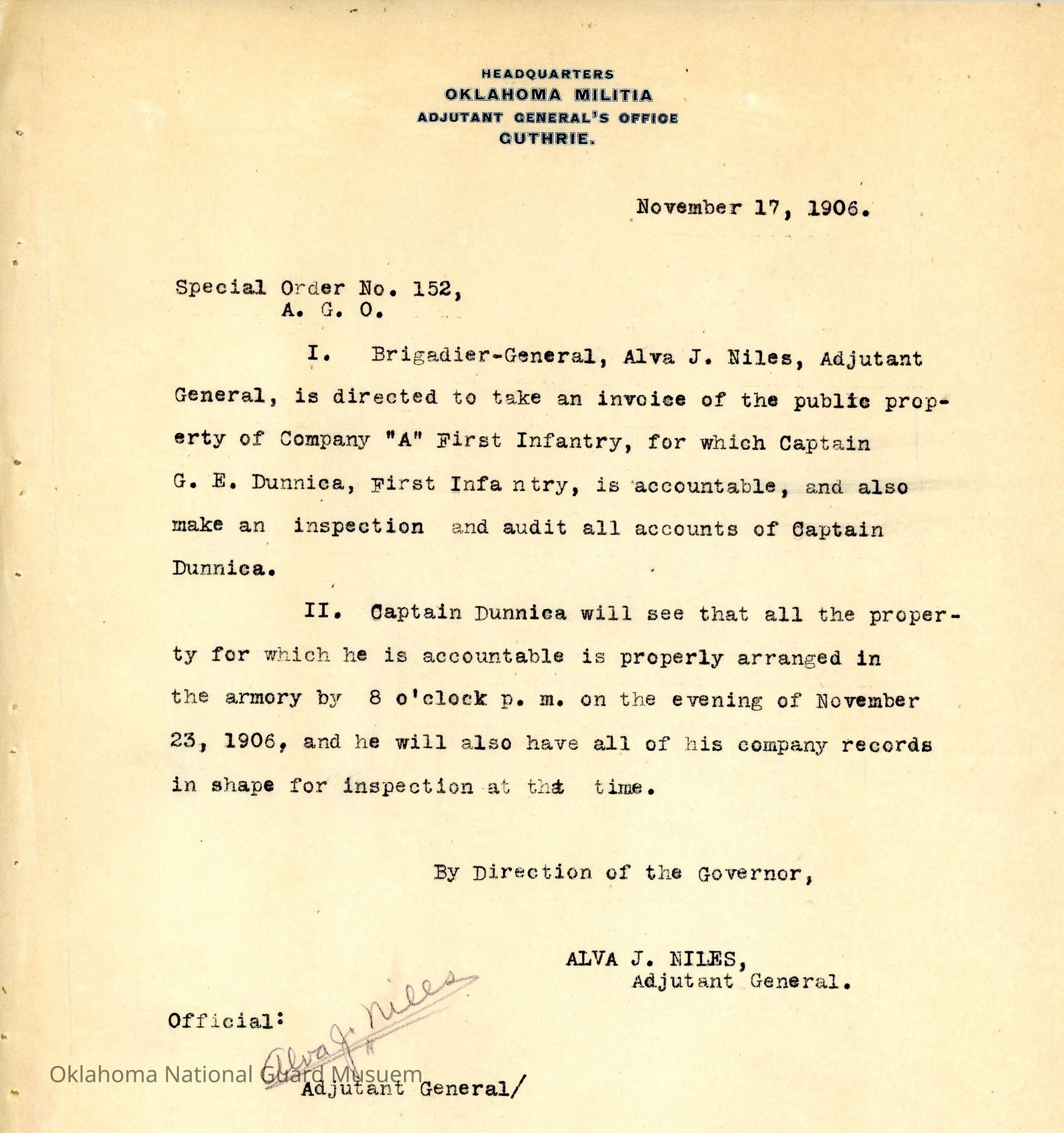 Special Order #152 from Headquarters Adjutant General's Office in Guthrie. The order instructs Alva J. Niles to take an invoice of public property of Company A First Infantry. G.E. Dunnica is also ordered to properly arrange the property and his records prior to the inspectionDate(s) of Creation