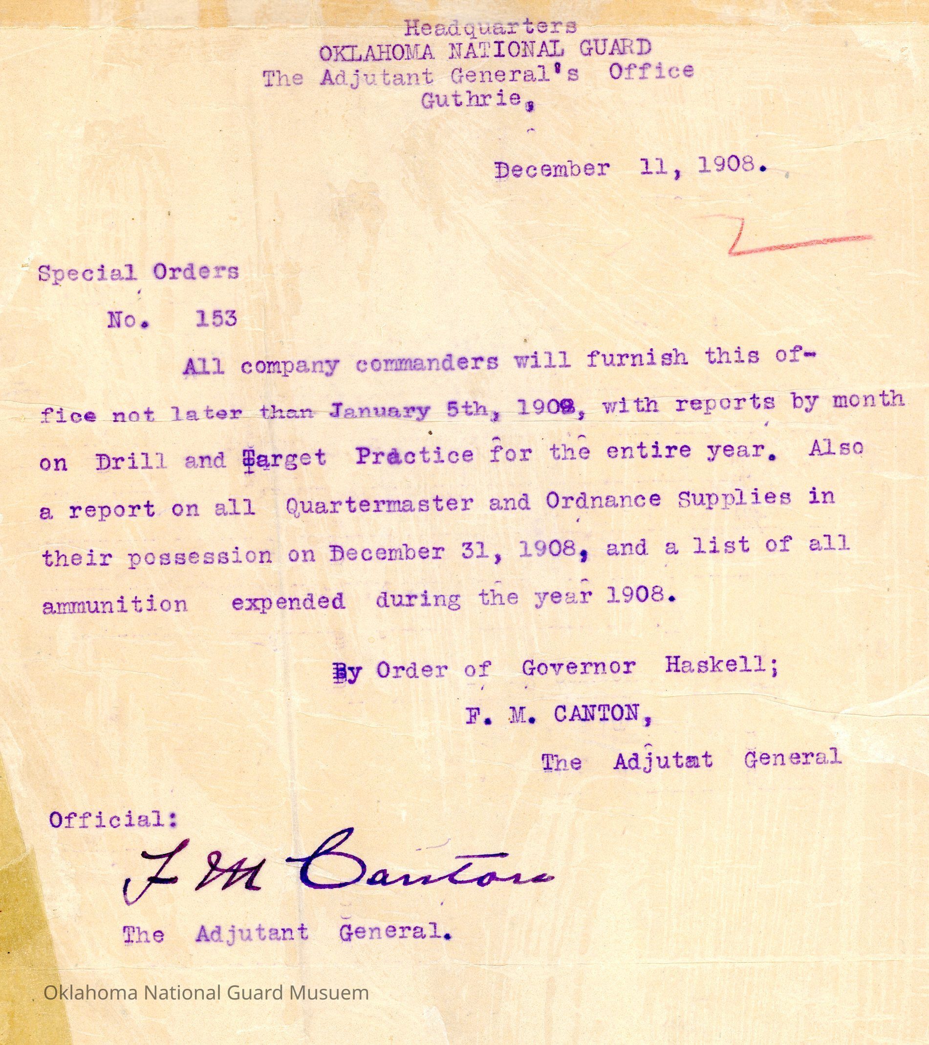 Special Order #153 from Headquarters Adjutant General's Office in Guthrie. The order instructs all company commanders to file reports on Drill and Target Practice for the entire year as well as reports on Quartermaster and Ordinance Supplies in their possessionDate(s) of Creation