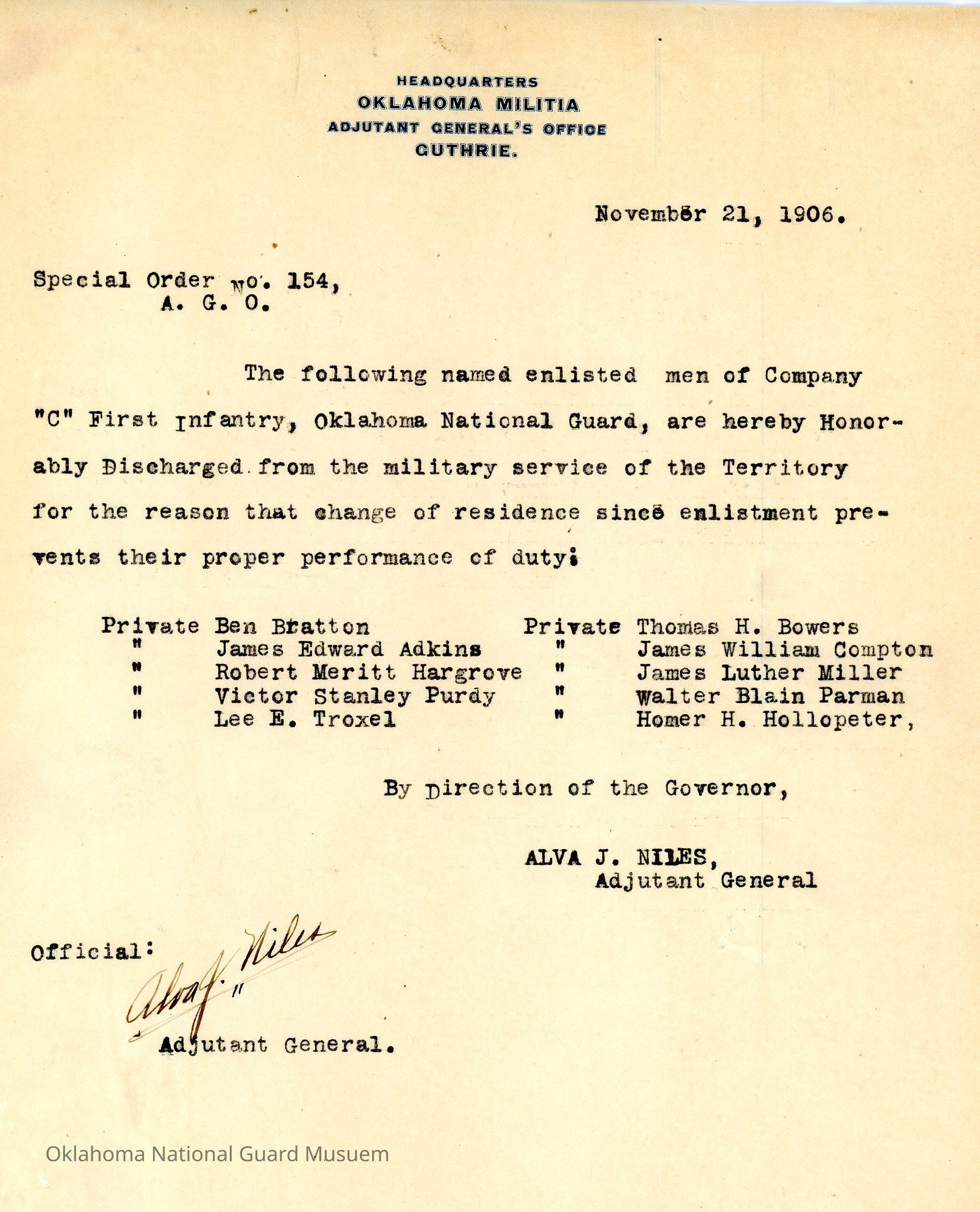 Adjutant General, Guthrie, Frank Frantz, Alva J. Niles, Honorable discharges, First Infantry, James Edward Adkins, Ben Bratton, Robert Meritt Hargrove, Victor Stanley Purdy, Lee E. Troxel, Thomas H. Bowers, James William Compton, James Luther Miller, Walter Blain Parman, Homer H. Hollopeter