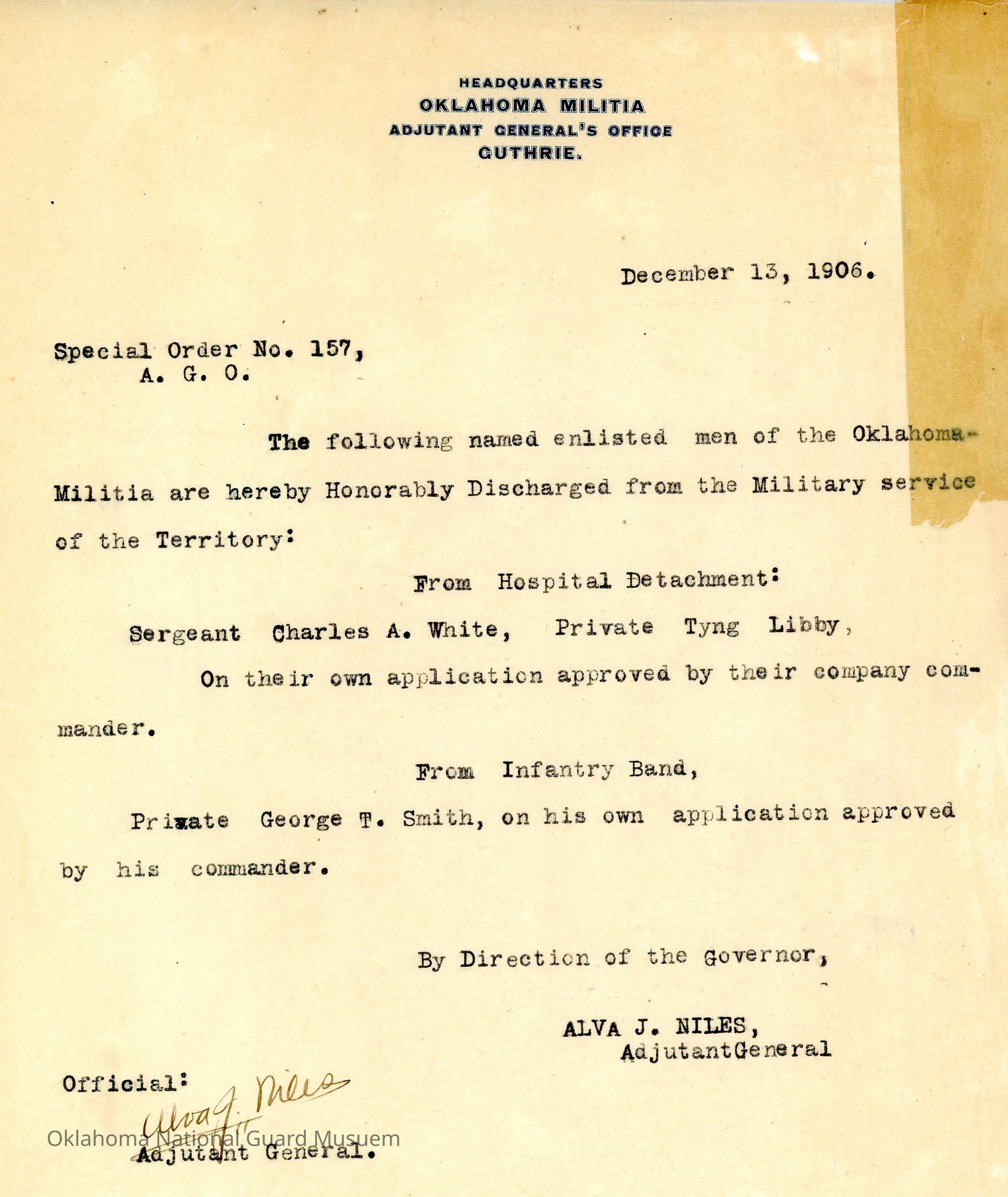 Adjutant General, Guthrie, Frank Frantz, Alva J. Niles, Honorable discharges, First Infantry Band, Hospital Detachment, Charles A. White, Tyng Libby, George T. Smith