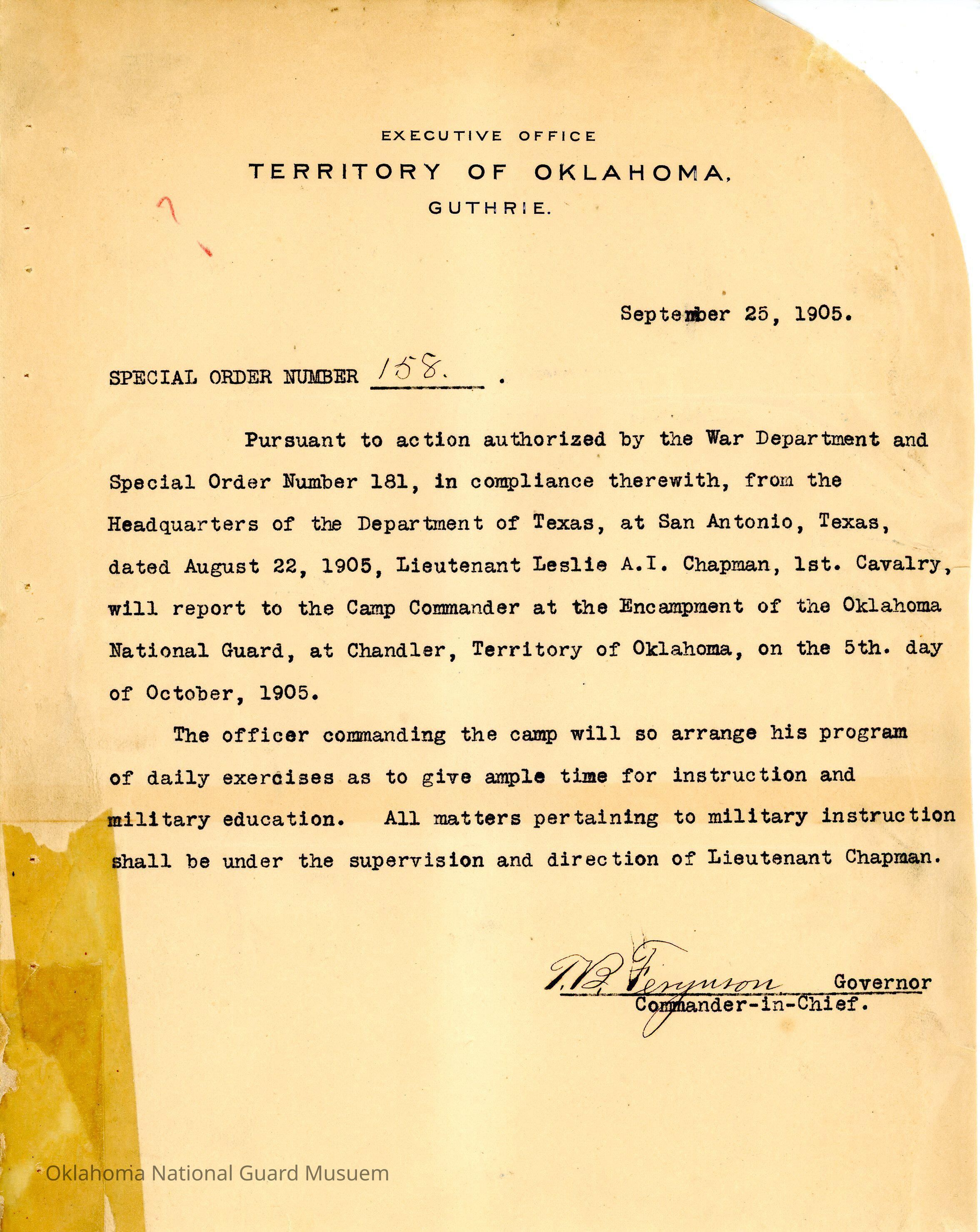 Special Order #158 from Headquarters Adjutant General's Office in Guthrie. The order orders Leslie A.I. Chapman 1st Cavalry to report to the Camp Commander at the Annual Encampment at ChandlerDate(s) of Creation