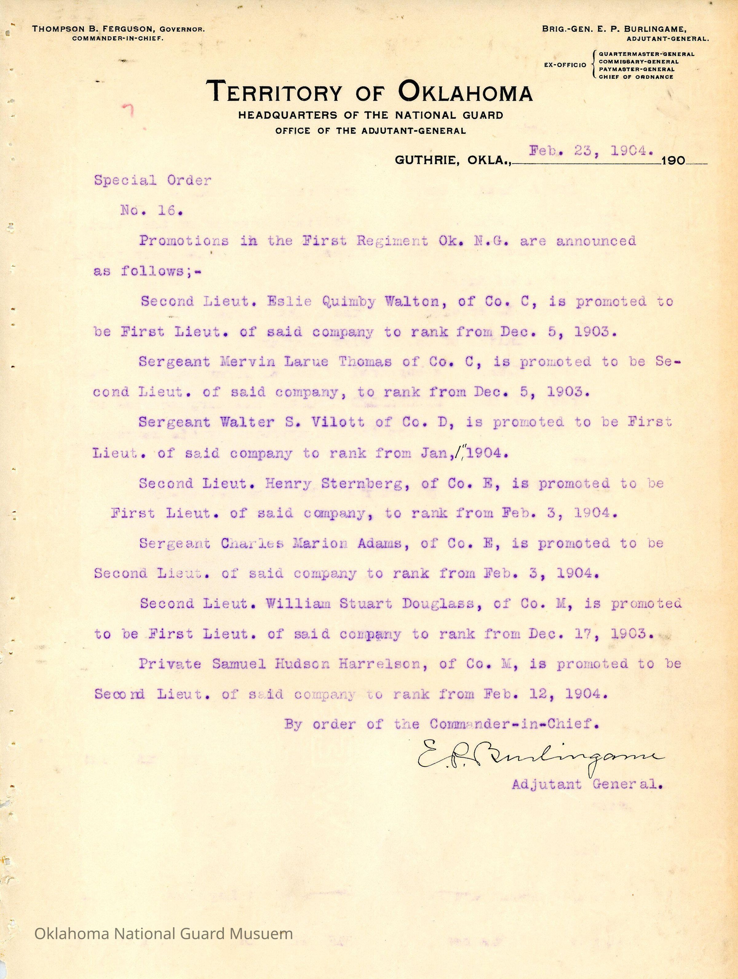 Adjutant General, Guthrie, E.P. Burlingame, Thompson B. Ferguson, First Regiment, Promotions, Eslie Quimby Walton, Mervin Larue Thomas, Walter S. Vilott, Henry Sternberg, Charles Marion Adams, William Stuart Douglass, Samuel Hudson Harrelson