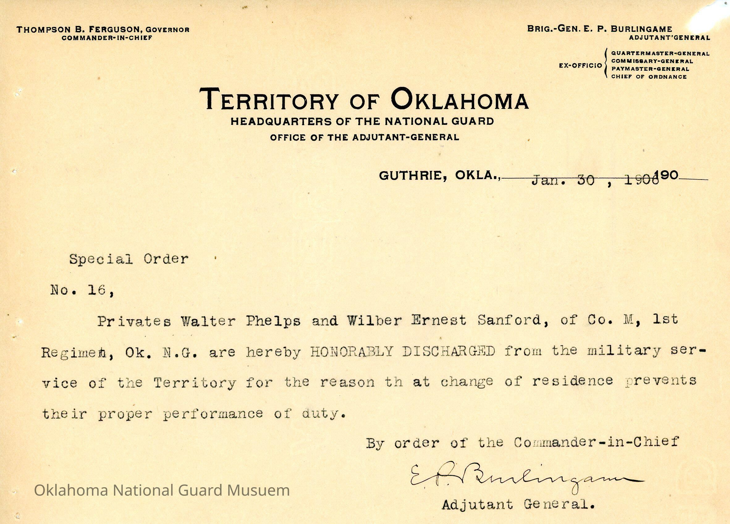 Adjutant General, Guthrie, E.P. Burlingame, Thompson B. Ferguson, First Regiment, Honorable discharges, Walter Phelps, Wilbur Ernest Sanford