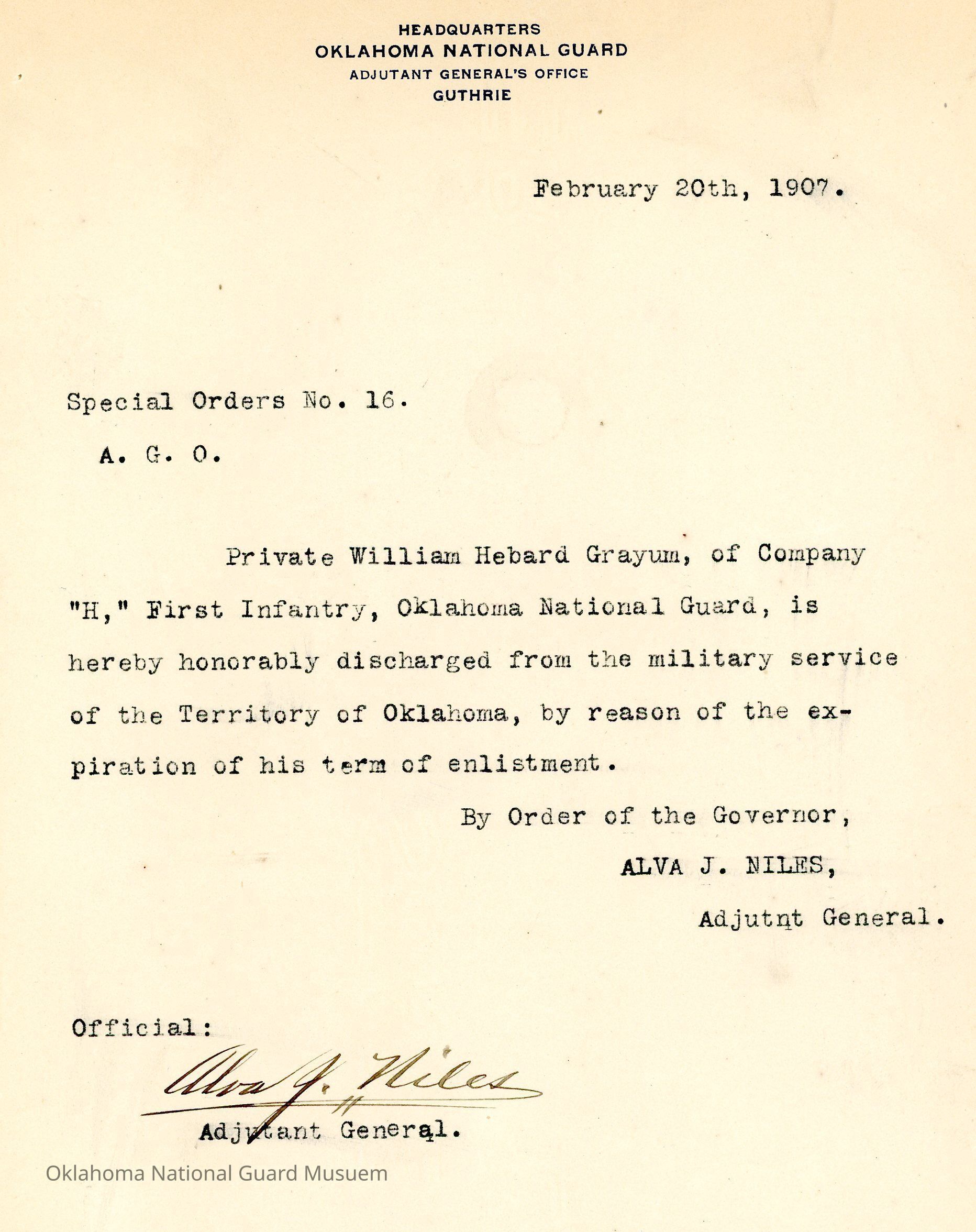 Adjutant General, Guthrie, Alva J. Niles, Honorable discharges, First Infantry, William Hebard Grayum