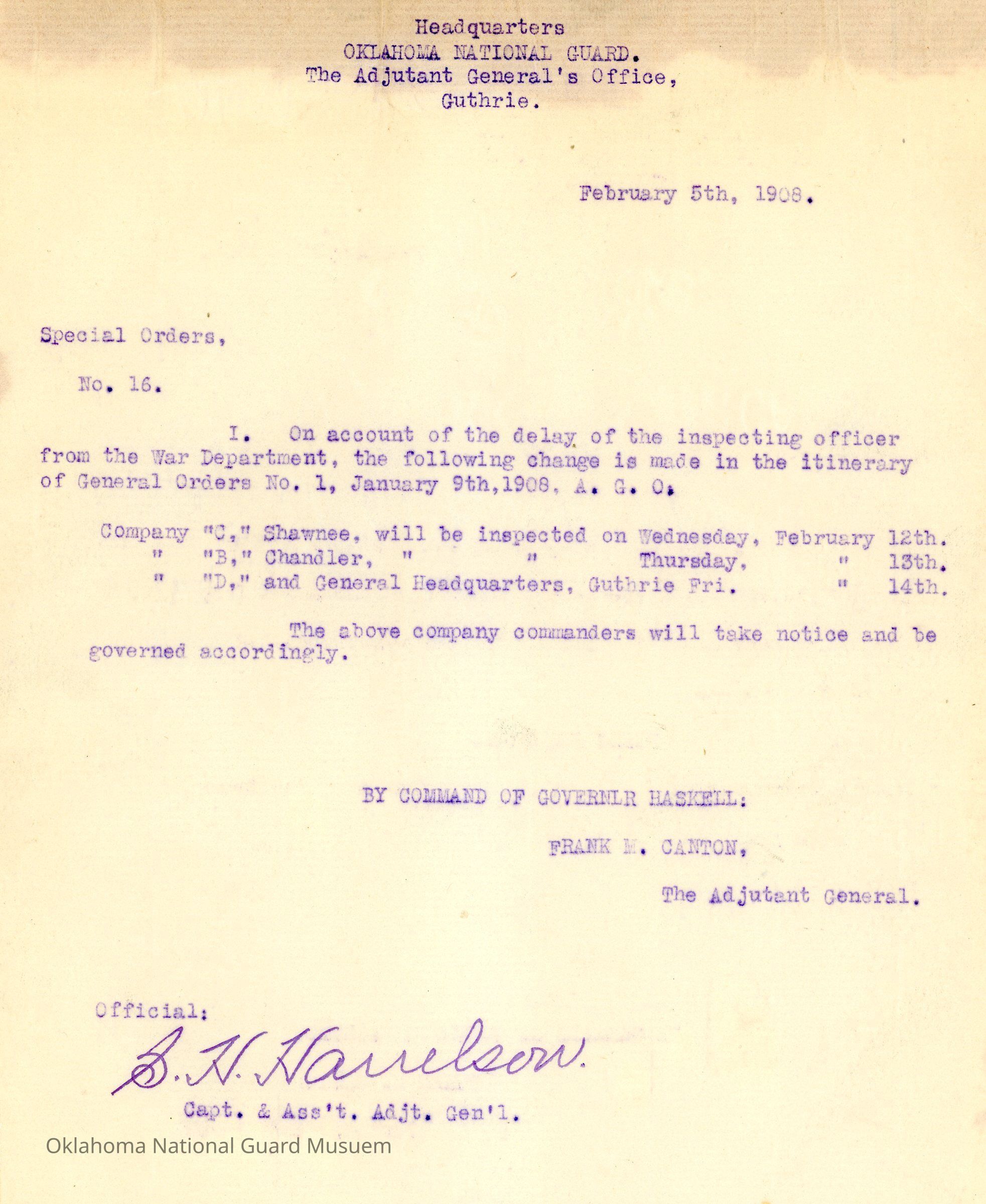 Special Order #16 from Headquarters Adjutant General's Office in Guthrie. The order lists the changes made in the itinerary from General Order #1 1908 related to company inspectionsDate(s) of Creation
