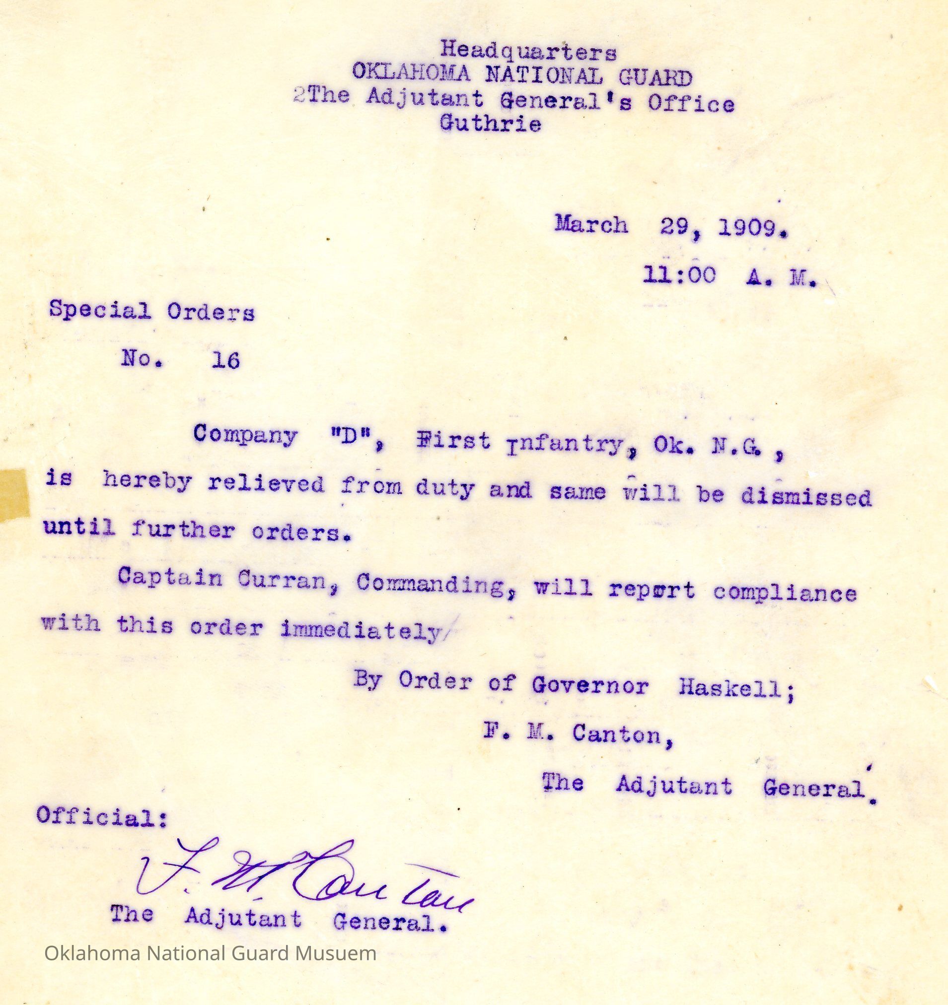 Special Order #16 from Headquarters Adjutant General's Office in Guthrie. The order relieves Company D First Infantry from duty and dismissedDate(s) of Creation