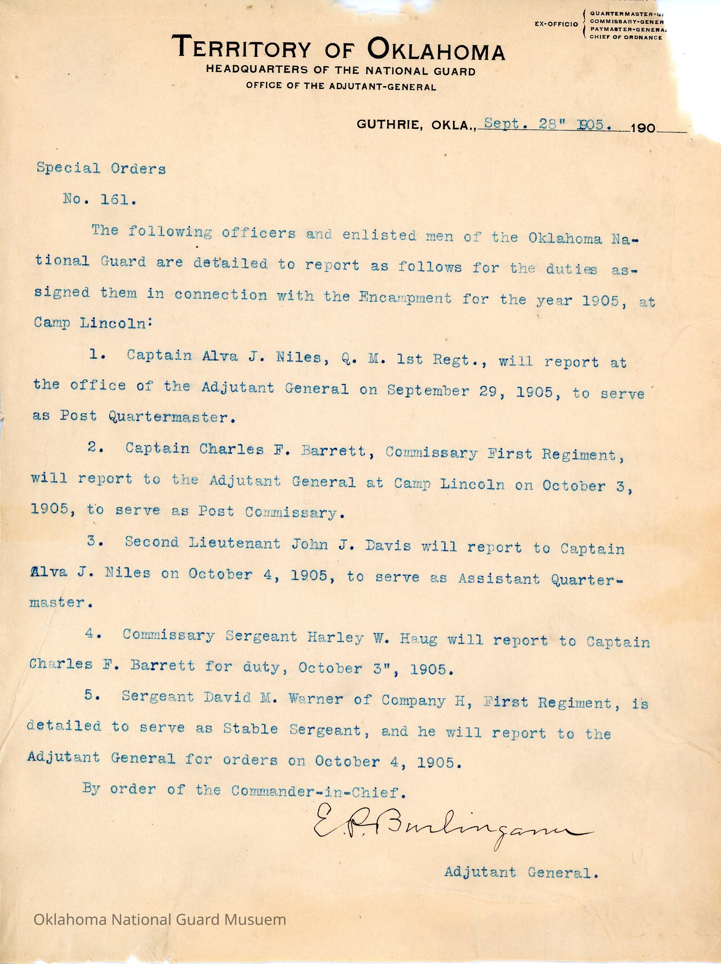 Special Order #161 from Headquarters Adjutant General's Office in Guthrie. The order details the duties for some of the men at the annual encampment at Camp LincolnDate(s) of Creation