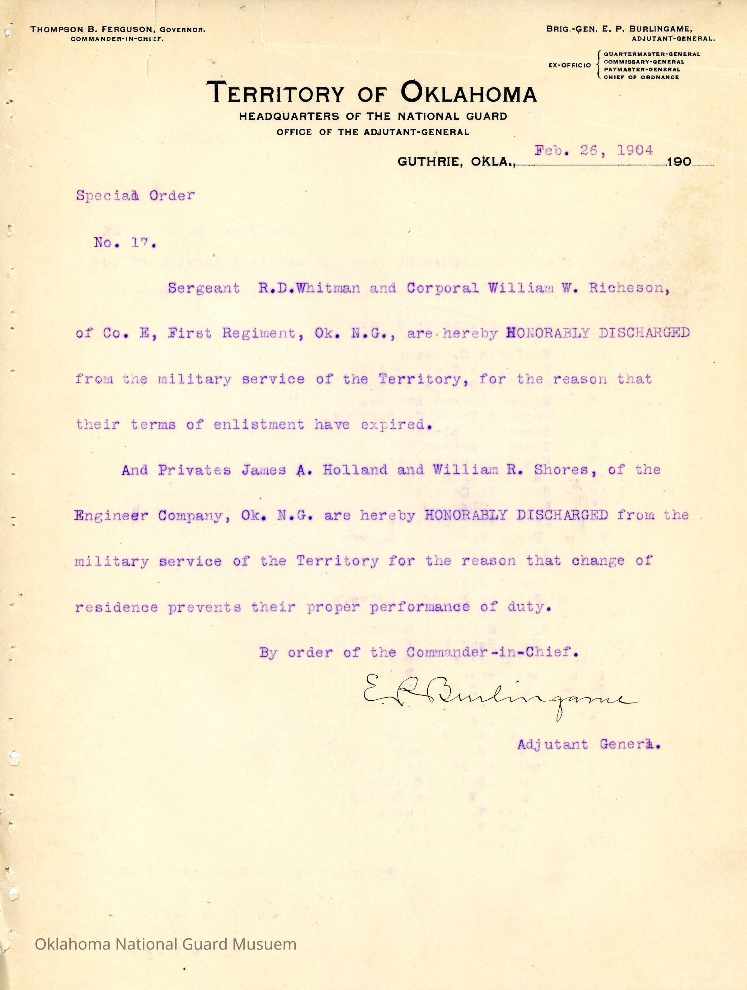Adjutant General, Guthrie, E.P. Burlingame, Thompson B. Ferguson, First Regiment, Honorable discharges, Engineer Company, R.D. Whitman, William W. Richeson, James E. Holland, William R. Shores