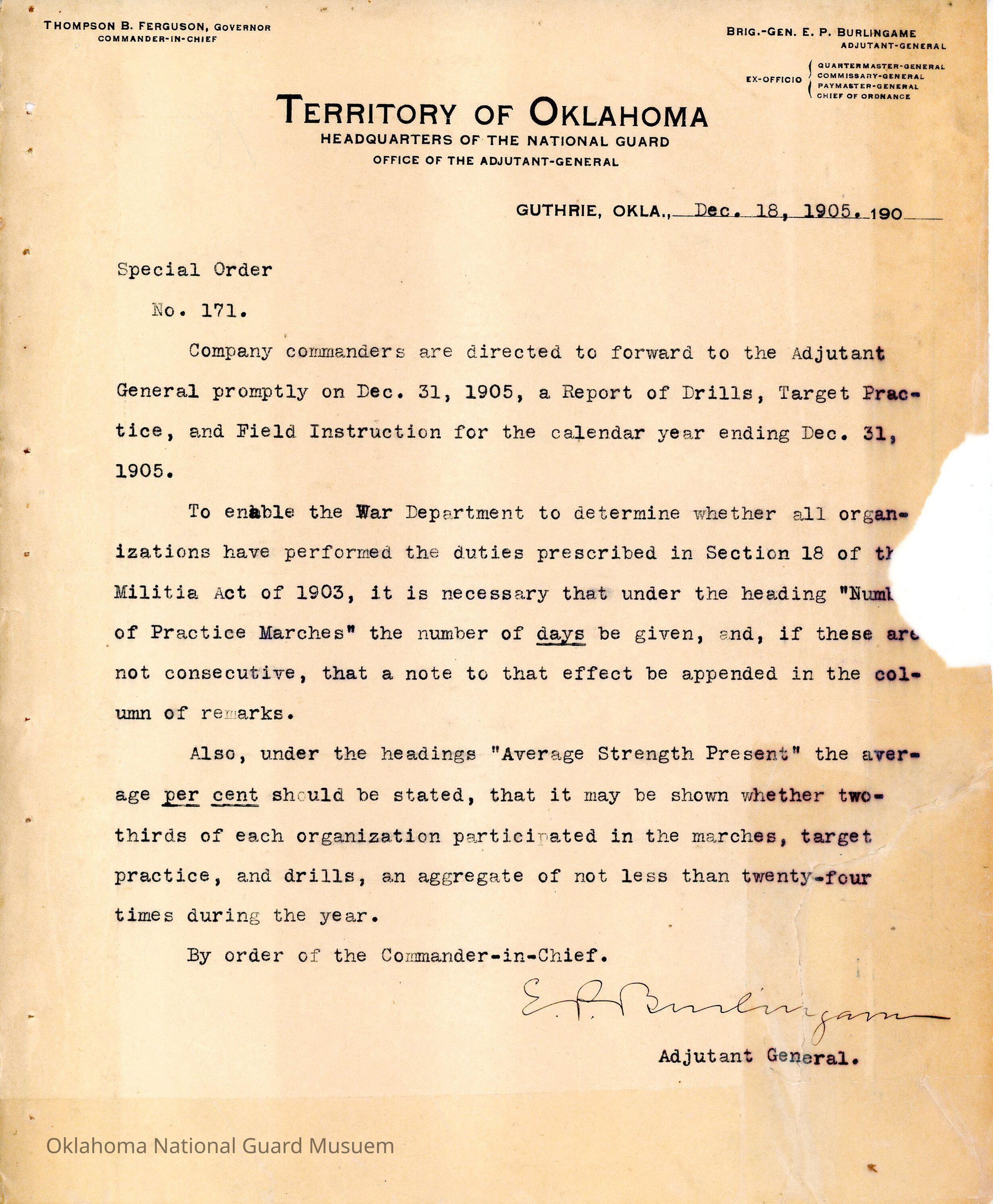 Special Order #171 from Headquarters Adjutant General's Office in Guthrie. The order directs all company commanders to file a Report of Drills, Target Practice, and Field Instruction to the Adjutant General for 1905.Date(s) of Creation