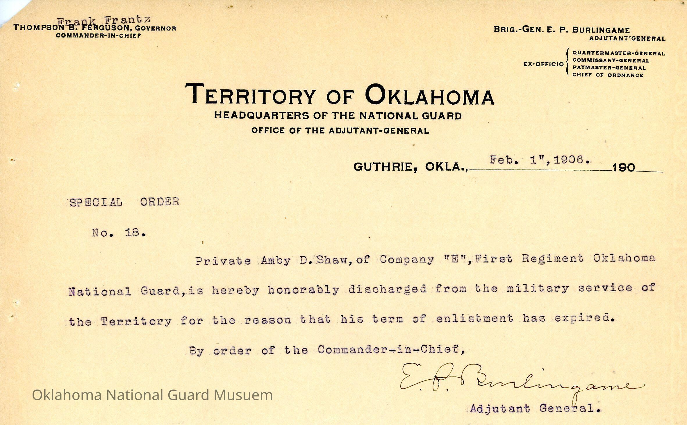 Adjutant General, Guthrie, E.P. Burlingame, Frank Frantz, First Regiment, Honorable discharges, Amby D. Shaw
