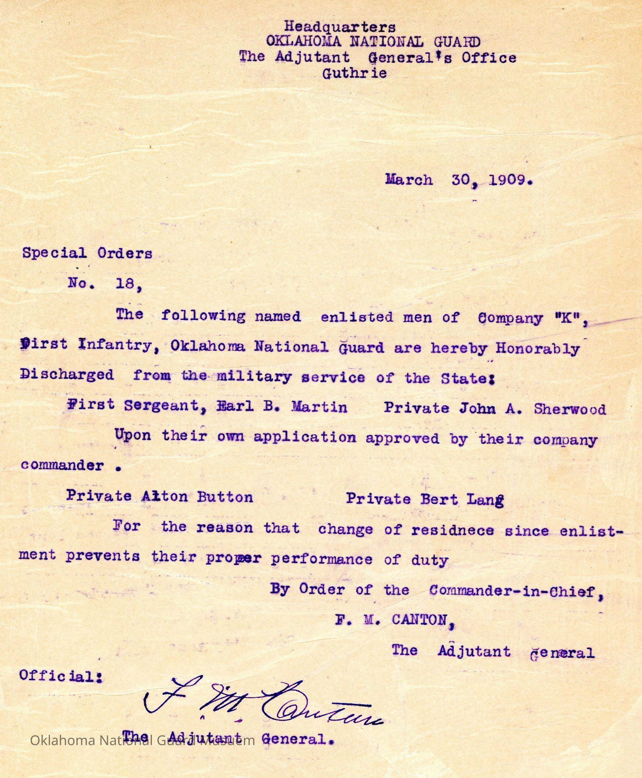 Adjutant General, Guthrie, Frank Canton, Charles Haskell, First Infantry, Honorable discharges, Earl B. Martin, John A. Sherwood, Alton Button, Bert Lang